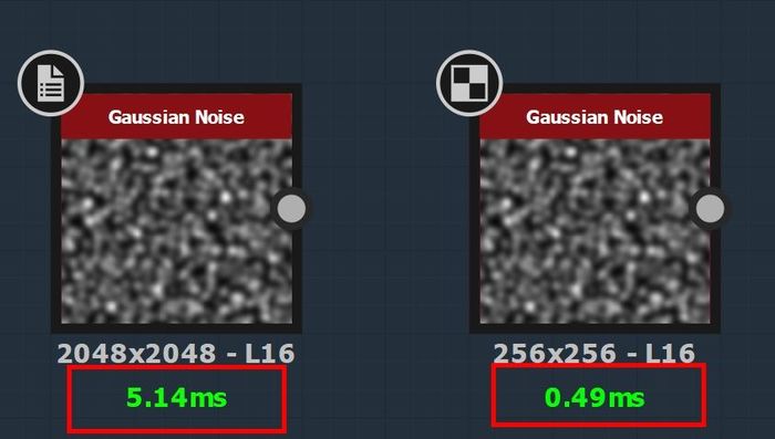 Некоторые шумы сильно увеличивают затраты на вычисления в зависимости от масштаба рисунка. Чем выше scale, тем медленнее нода. Это относится к таким нодам, как BnW Spots, Directional Noise, Cells, Dirt, а также к другим, в которых можно увеличить scale. Поэтому, когда требуется добавить в текстуру мелкий шум, лучше заменить его более дешевым и быстрыми аналогами: White Noise, Fractal Sum Base, Blue Fast Noise и Anisotropic Noise.