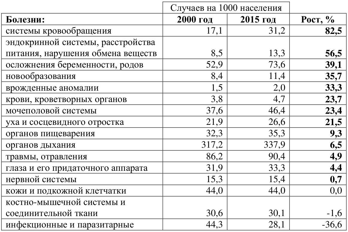 В XXI веке зафиксирована пугающая статистика по объему заболеваний в России — почти по всем классам заболеваний, представленным в данных Росстата, в период 2000—2015 гг. фиксируется существенный рост заболеваемости: