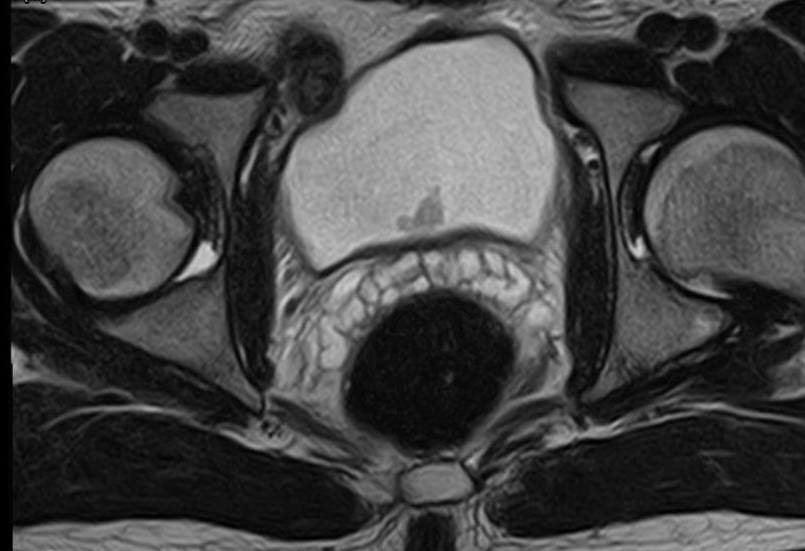 При МР-исследовании органов малого таза с контрастным усилением определяется: Мочевой пузырь слабого наполнения. В области мочепузырного треугольника по задней стенке определяется экзофитное образование размерами 12х5х11 мм, с признаками раннего накопления контрастного препарата и рестрикции диффузии. Признаков распространения процесса на мышечный слой не выявлено. Мочеточники не расширены, устья свободны.