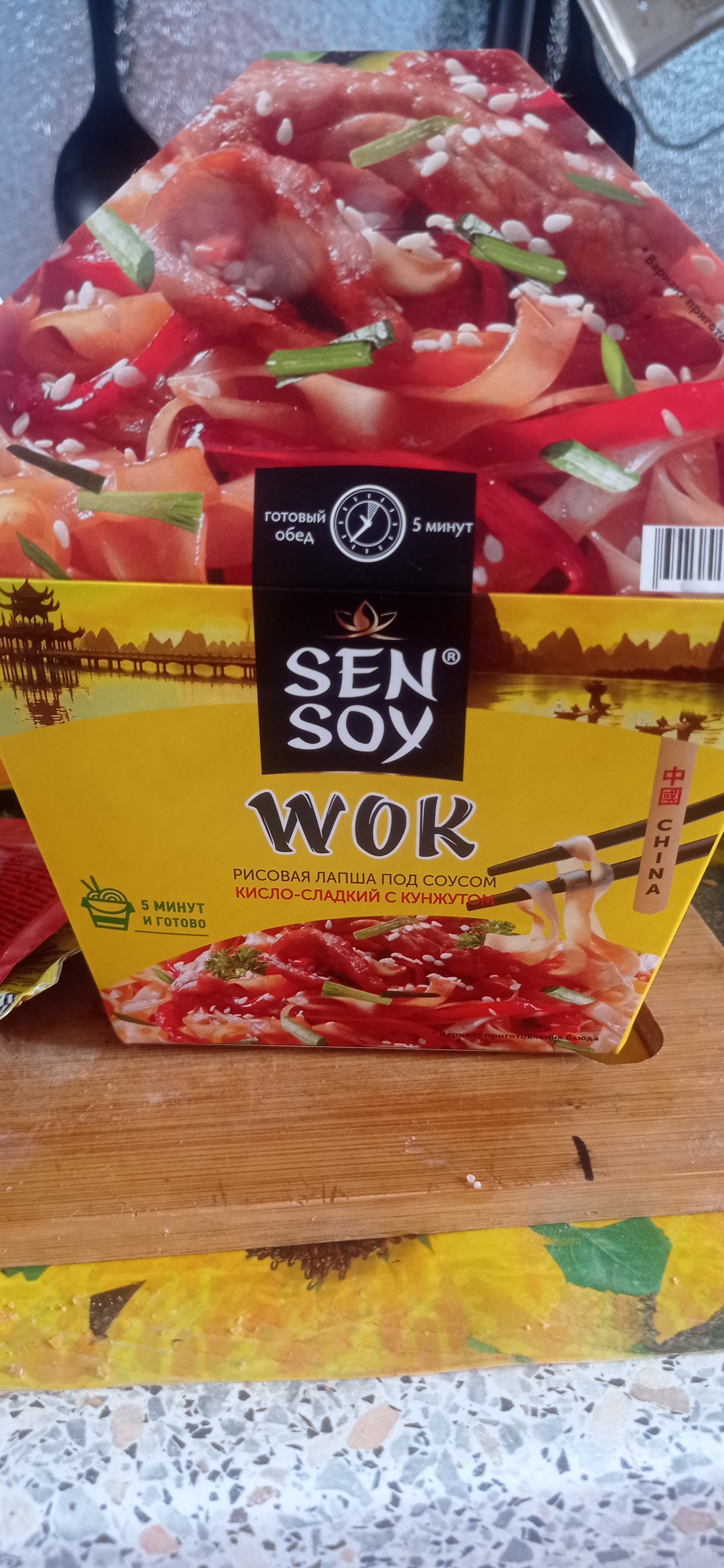 Купила в семейном магните рядом с домом рисовую лапшу Sen Soy Wok под соусом. Соус кисло-сладкий с кунжутом. Необычное сочетание.