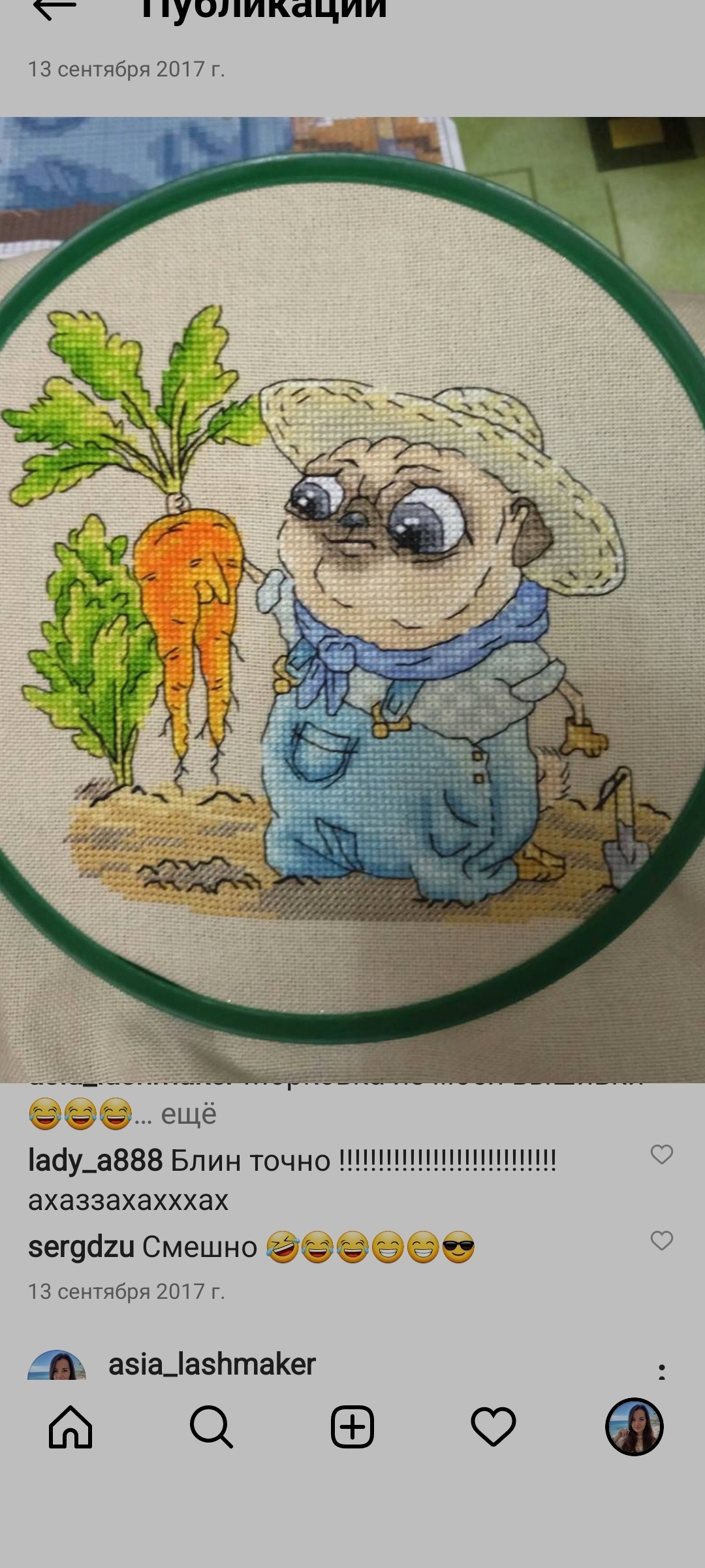 Когда эти мопсы появились в крестике, муж сделал мне подарок и купил все схемы, которые успела нарисовать дизайнер Катерина Бесперстова.
