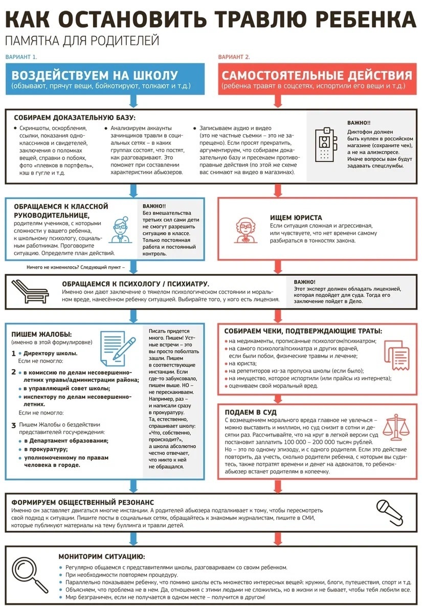 Если я узнаю, что на моих детей кто-то пытается устраивать травлю, то я такое в школе устрою, что обидчики на пушечный выстрел будут бояться подойти к ним. И исключительно законными методами.