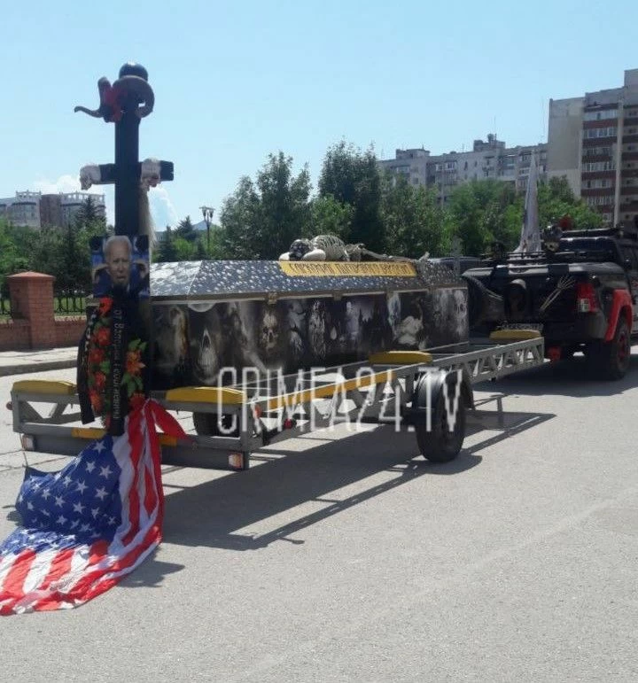 Днём по улицам Евпатории проехала машина с прицепом, на котором якобы находился гроб президента США Джо Байдена.