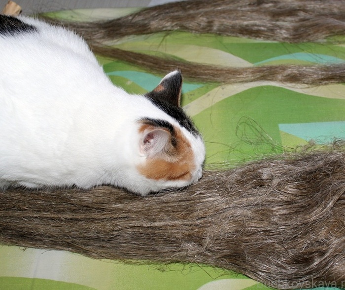 И да, на фото процесс вычёсывания льна. Он ещё пахнет белизной (в кондиционере прополоскала позже), а коты мои ну очень уважают этот запах))