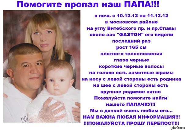 1236 EvilBaby Опять пропажа 13 лет назад "Перепостино" с ВК. Здесь не видел. Звать Сафин Шамиль Эльдарович. Город Санкт-Петербург. https://vk.com/id193404025 Общество