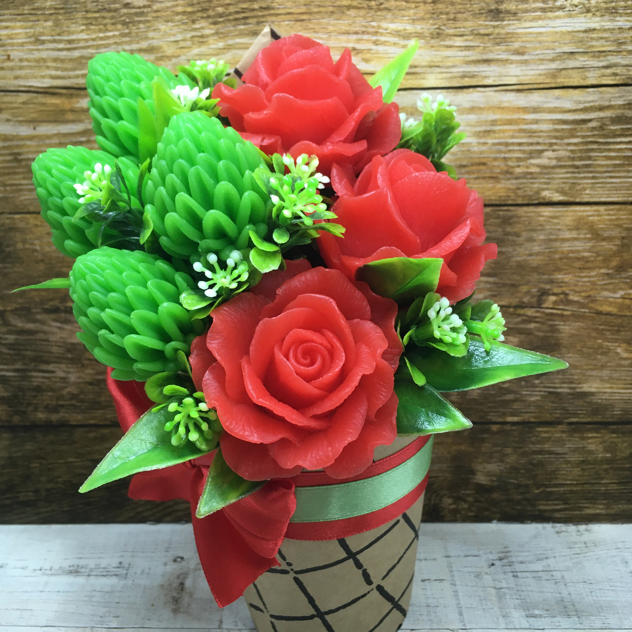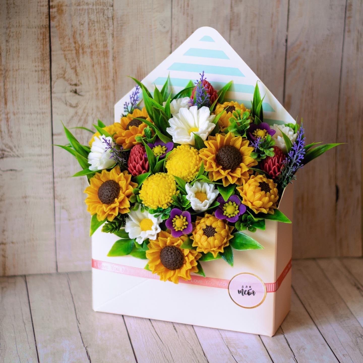 Пожалуй, самый любимый сейчас у меня большой полевой букет. Мыльной основы на него ушло чуть больше полкило, а в высоту он ~30 см.