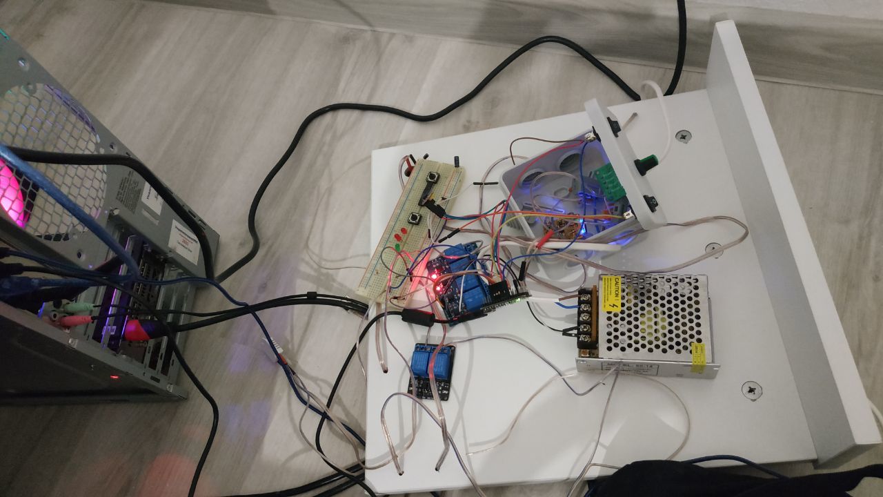 Выводы 5 вольт: увлажнитель и вентилятор обдува, каждый своего цвета. Увлажнитель белые, вентилятор черные. А вентилятор вытяжки так же имеет свою индивидуальную распиловку и свой цвет.