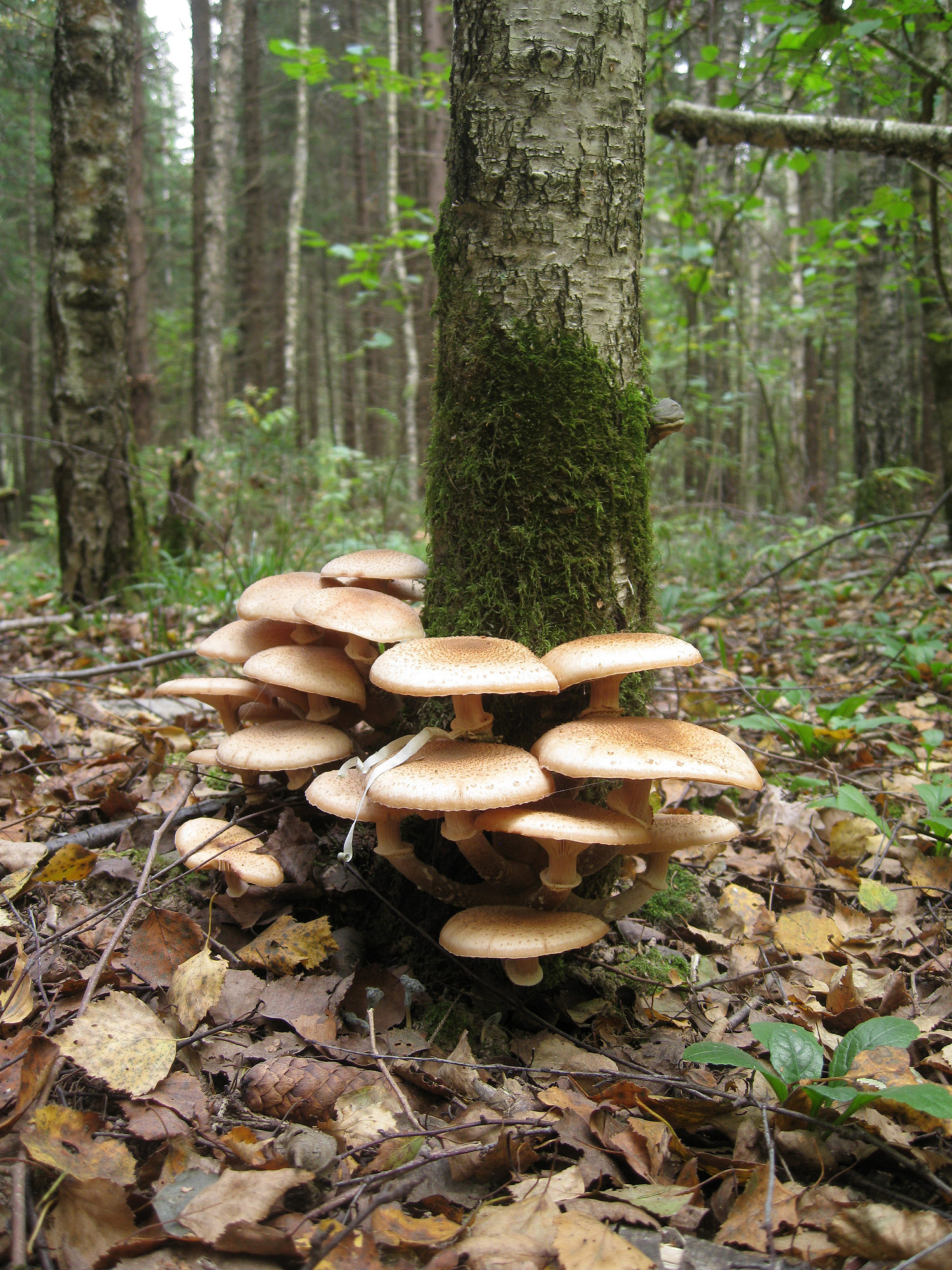 А вот чего в ельнике с примесью берёзы много — так это опят. На земле, на пнях, на корнях.