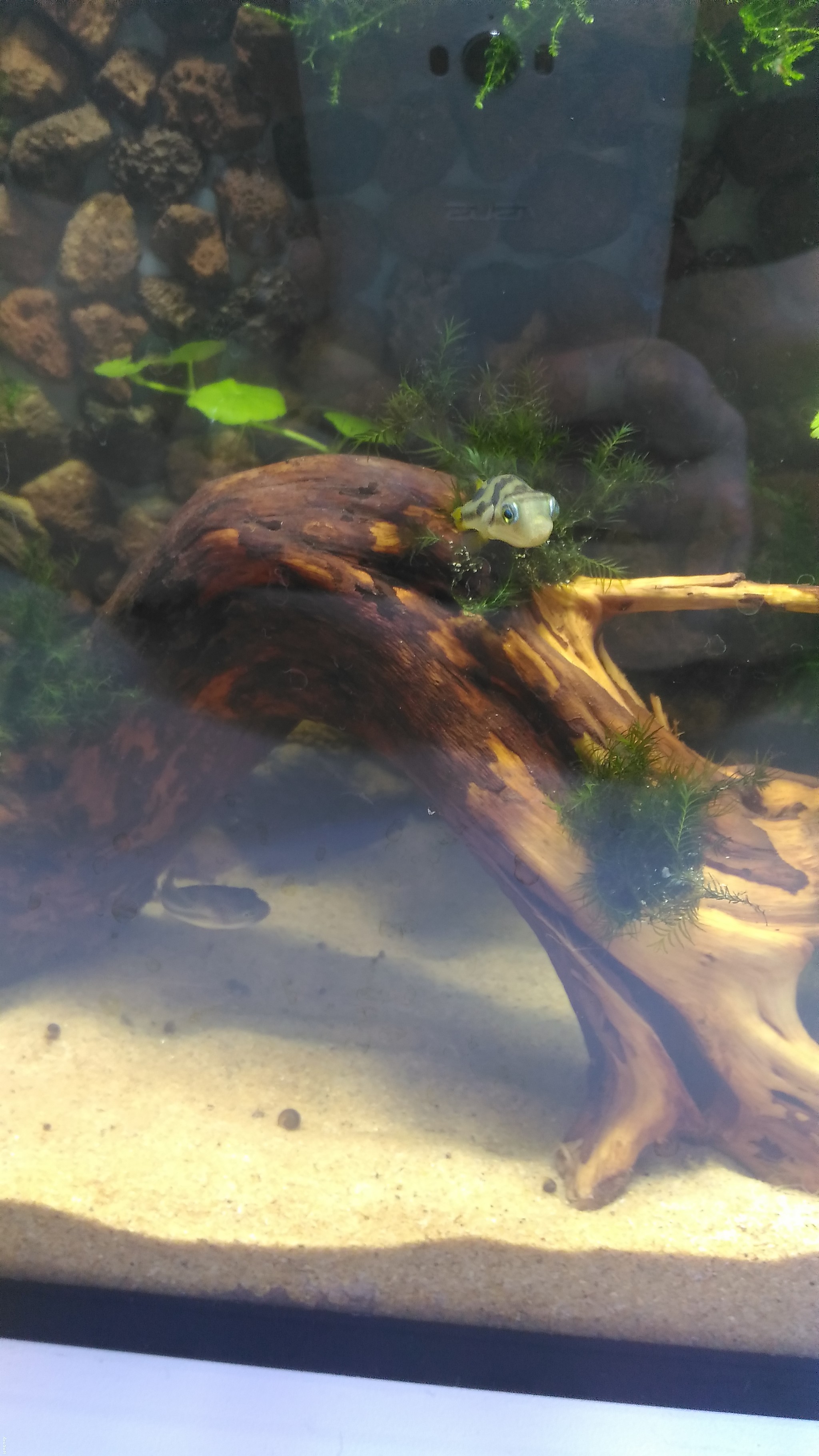 Интересно, что все тетрадоны, которые у меня были едят только мелких улиток катушек размером 1-3 мм, но один из них есть еще замороженный мотыль, другие даже пробовать его не стали. В целом, очень забавные рыбки, наблюдать за ними одно удовольствие. Особенно интересно смотреть, как они высматривают улиток своими огромными глазками, которые постоянно находятся у них в движении относительно головы, очень необычно)