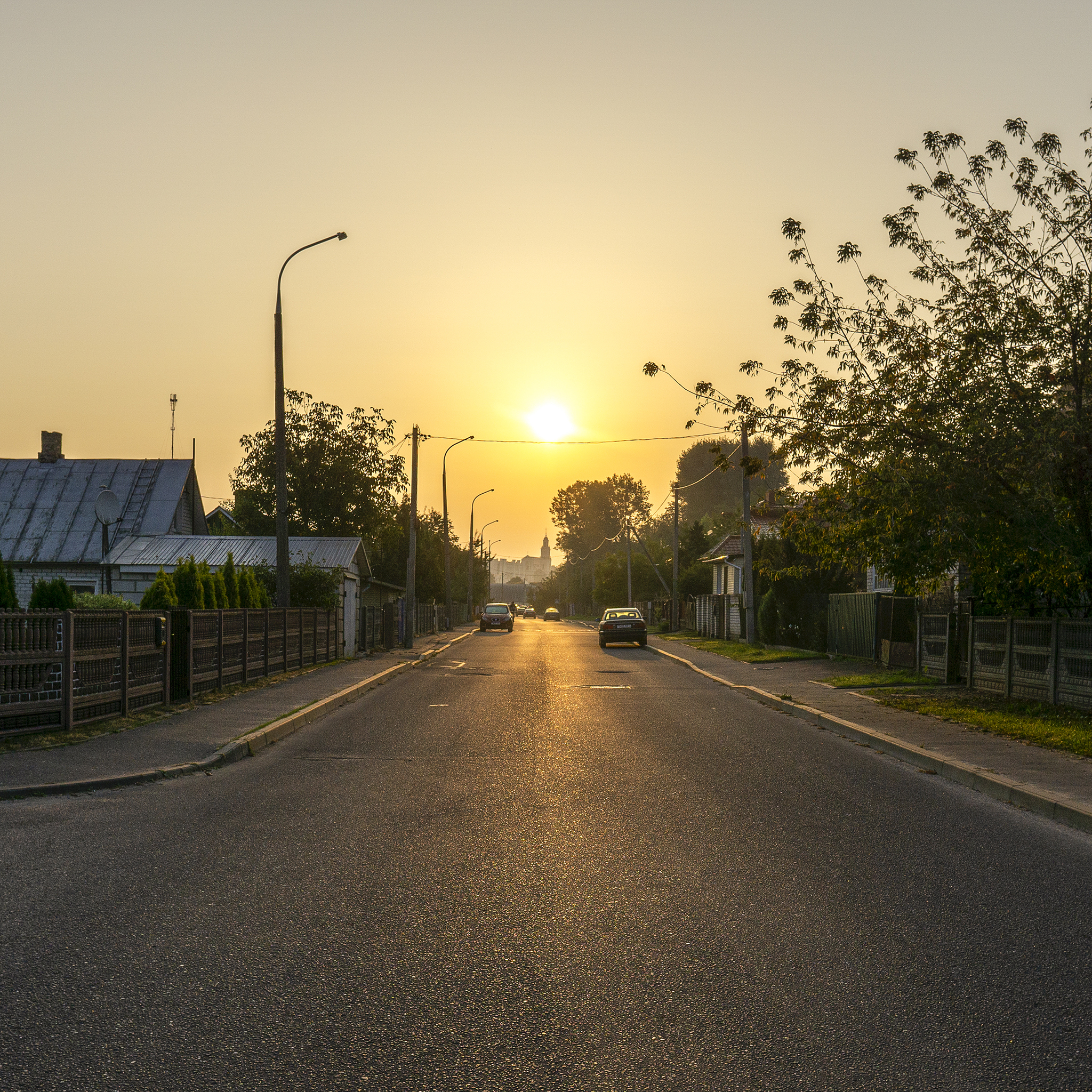 Повторяя форму реки, вдоль которой она проложена, дорога изгибается, чтобы попытаться испортить мне геометрию кадра. Не смотря на нежелание улицы быть прямой, вдали на горизонте(около 1.5 км от места съемки) можно увидеть колокольню католического храма, расположеного на противоположном берегу реки, а ещё немного дальше(около 150млн км от места съемки) можно наблюдать жёлтый карлик диаметром 109 земных.