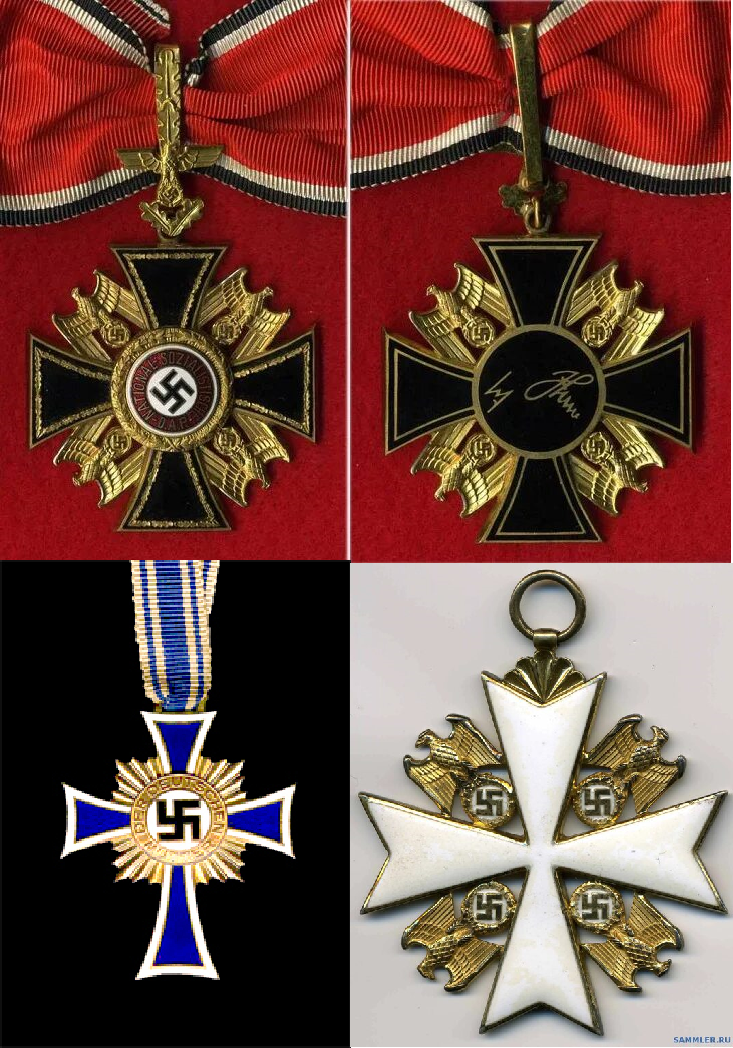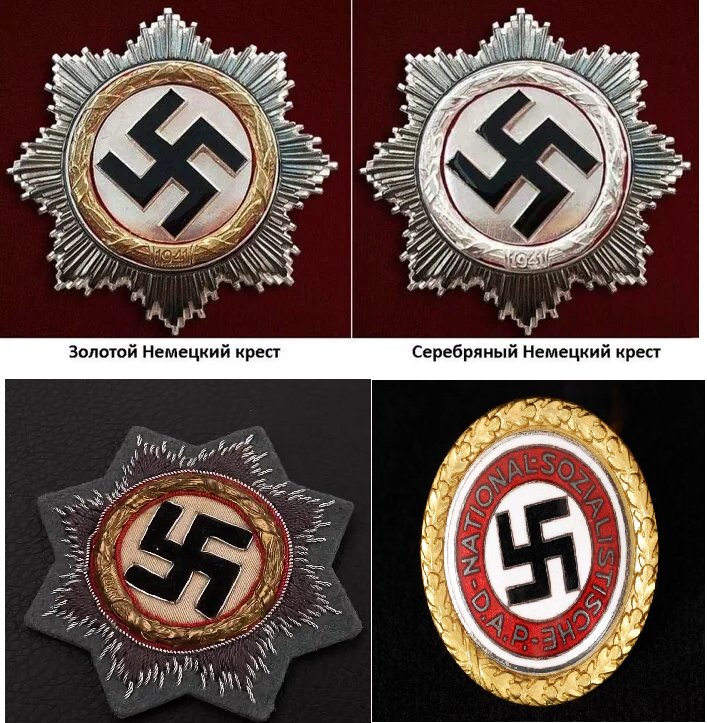 Немецкий крест - награда для тех кто уже имеет железный крест 1 класса, но на Рыцарскую степень Железного креста еще не наишачил. Имел 2 степени в серебре и золоте, в вермахте его называли "партийный значок для близоруких" или "яичницей гитлера", второе прозвище появилось в связи с тем, что данный орден в полевых условиях предложили заменять тряпичной нашивной копией, которая выглядела как коррупция убожество.