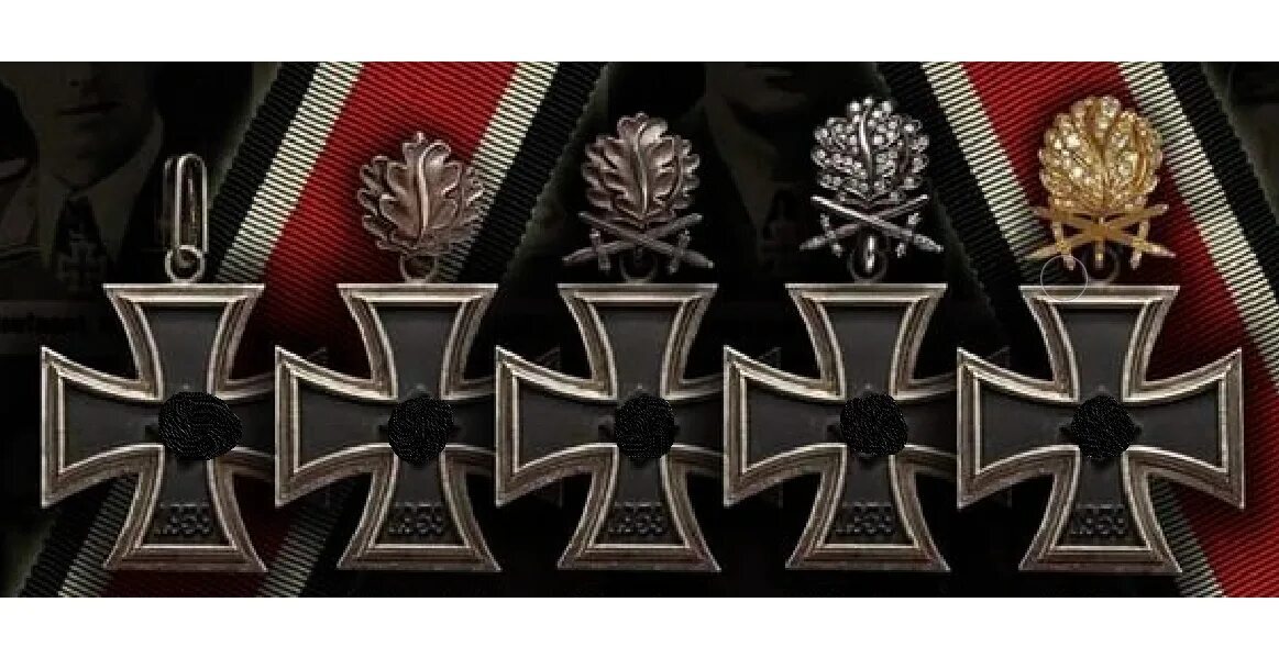 1) Рыцарский крест Железного креста 2) Рыцарский крест Железного креста с дубовыми листьями 3) Рыцарский крест Железного креста с дубовыми листьями и мечами 4) Рыцарский крест Железного креста с дубовыми листьями, мечами и бриллиантами 5) Рыцарский крест Железного креста с золотыми дубовыми листьями, мечами и бриллиантами