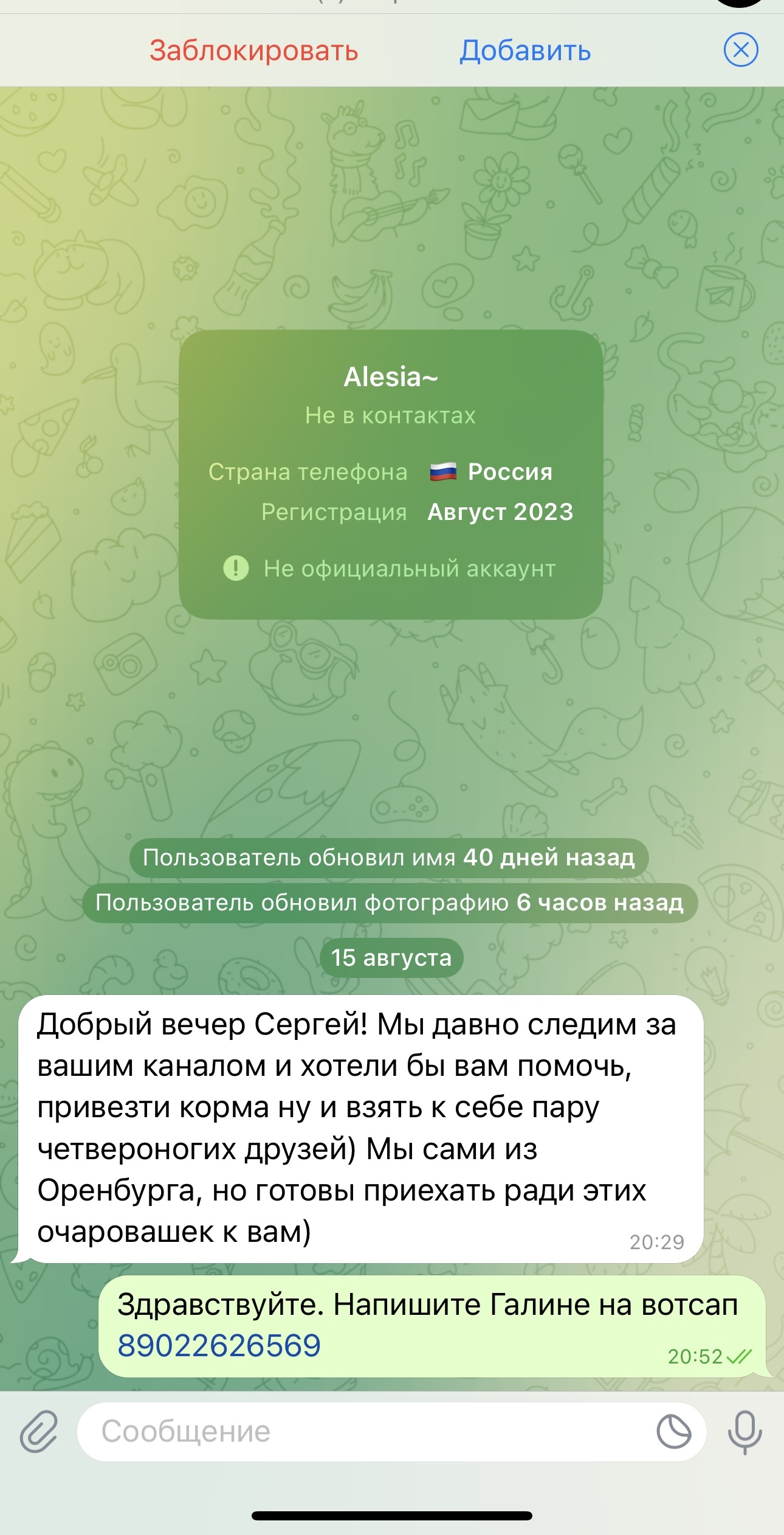 «Мы давно следим за вашим каналом, хотим привезти корма и взять пару четвероногих друзей!»