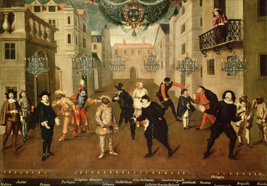 1. Французские и итальянские актеры и шуты в возрасте 60 лет и старше. Мольер в костюме Арнольфа крайний слева