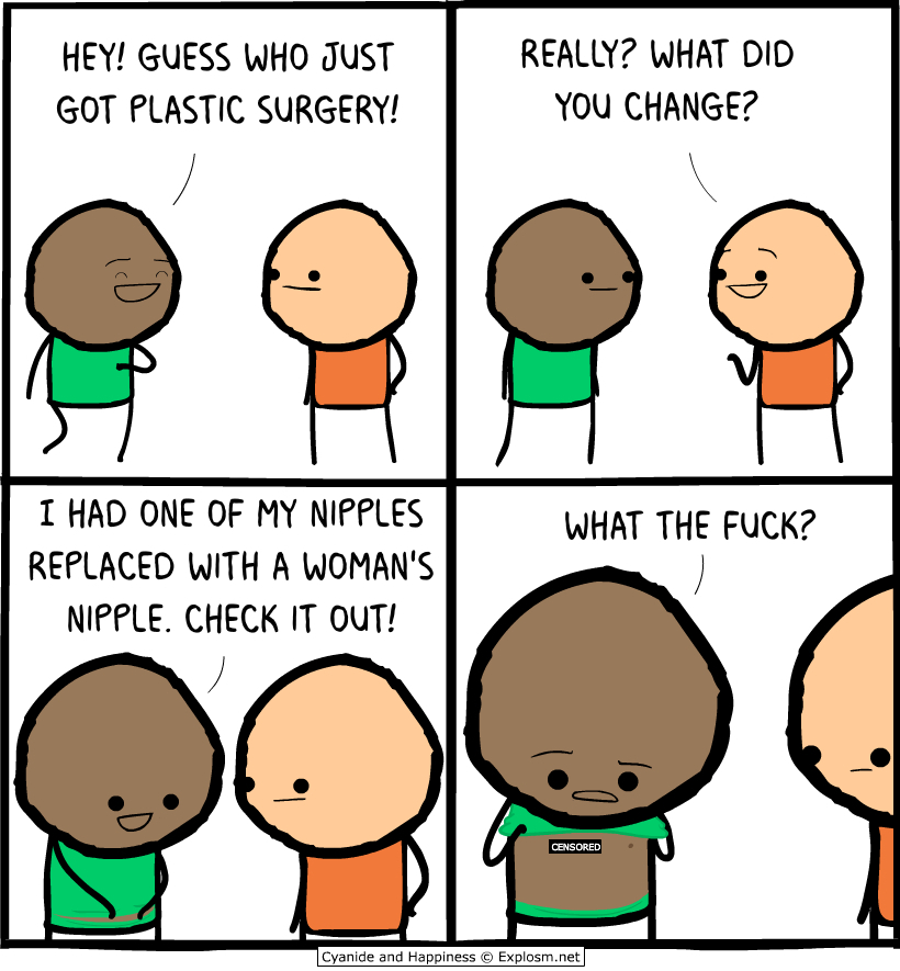 Да, об этом и спрашиваю, почему так? В чем, с визуальной точки зрения, разница между женским соском и мужским, кроме, конечно, того, что женский дает молоко? Ну, теперь ещё и задницей?)