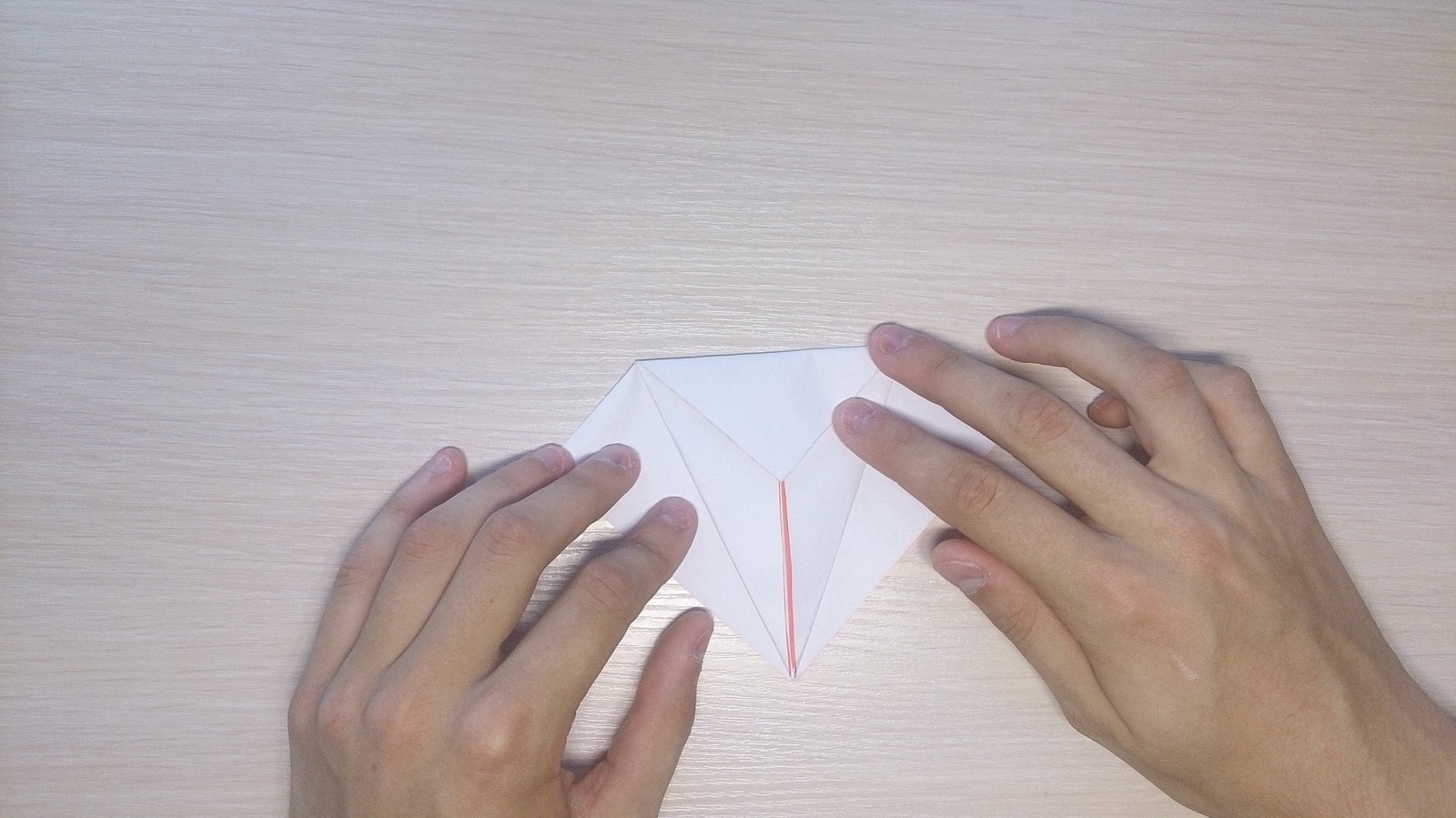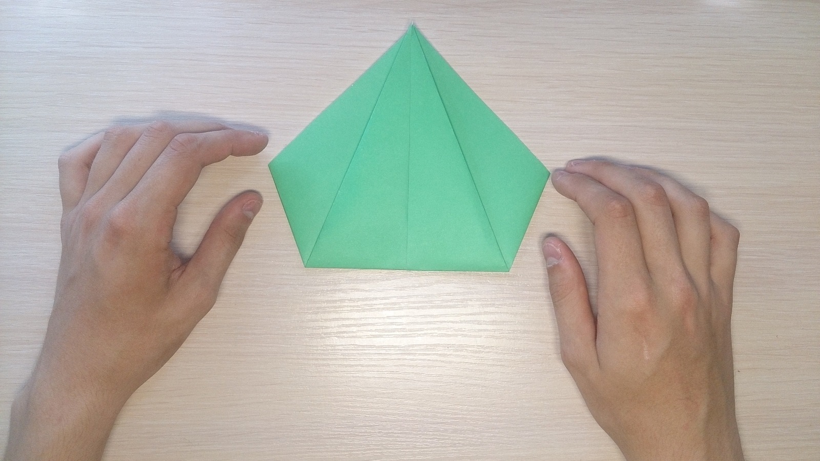 Шаг 2. Просто нажмите пальцем в центр. Если сгибы выполнены правильно, то фигура сама сложится, а если нет, то сложите ее самостоятельно, как на гифке.