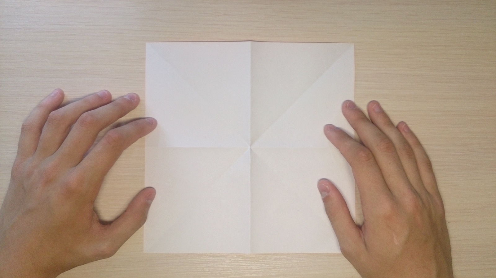 Шаг 1. Возьмите квадрат и согните его по обеим диагоналям (так, чтобы сгибы были направлены в одну сторону), а затем согните его пополам с обеих сторон (но уже так, чтобы сгибы были направлены в другую сторону от "диагональных сгибов").