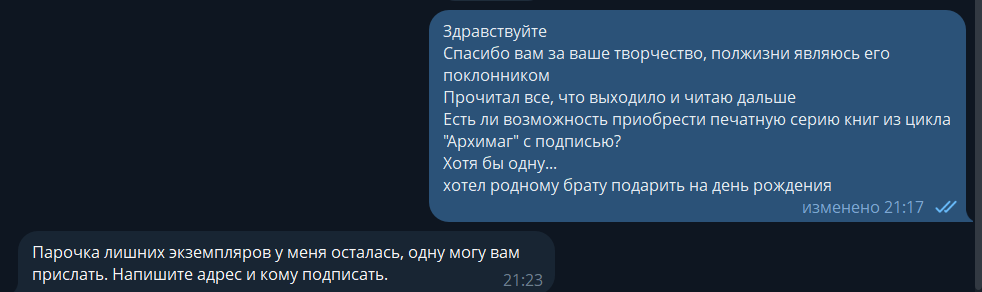 Вот такое маленькое настоящее чудо случилось. Неожиданно, что Александр ответил и помог с подарком. Теперь у брата дома будет настоящий артефакт: подписанная специально для него книга любимого автора.