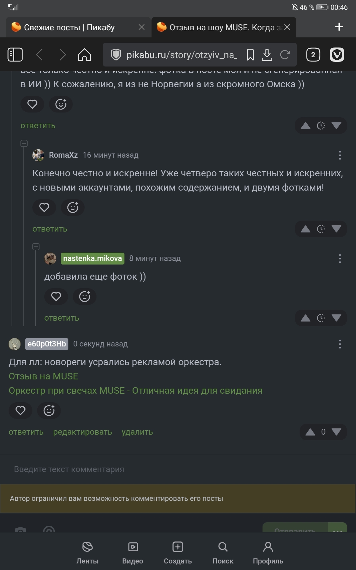 В течении часа вылупились несколько новорегов с рекламой своего оркестра. Один из них, @nastenka.mikova, блочит комменты.