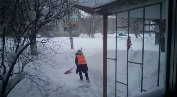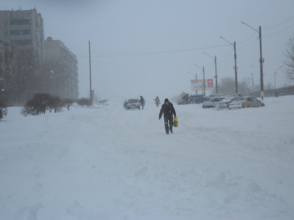 Когда в Орске не проходит снегоуборочная техника - получаются такие шикарные кадры. Ялтинская ул., мужик чешет по проезжей