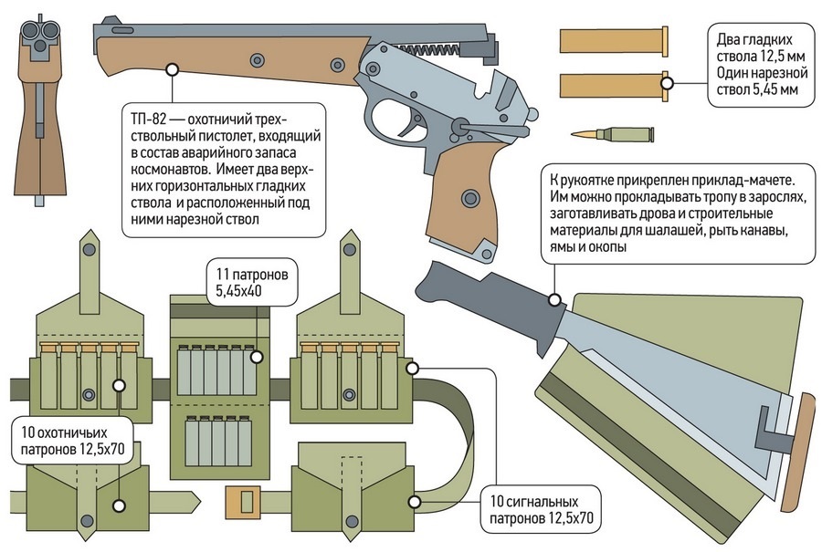 ТП-82 — охотничий неавтоматический трёхствольный пистолет, входящий в состав комплекса СОНАЗ(стрелковое оружие носимого аварийного запаса), которым вооружаются российские космонавты для защиты от опасных зверей и криминальных элементов, добычи пищи охотой и подачи световых сигналов визуального наблюдения в случае приземления или приводнения в безлюдной местности. Имеет два верхних горизонтальных гладких ствола 32-го охотничьего калибра и расположенный под ними нарезной ствол калибра 5,45 мм. В боекомплект СОНАЗ входят специально разработанные патроны калибра 5,45 мм СП — П (пулевой), 32-го калибра СП — Д (дробь № 3) и 32-го калибра СП — С (сигнальный).