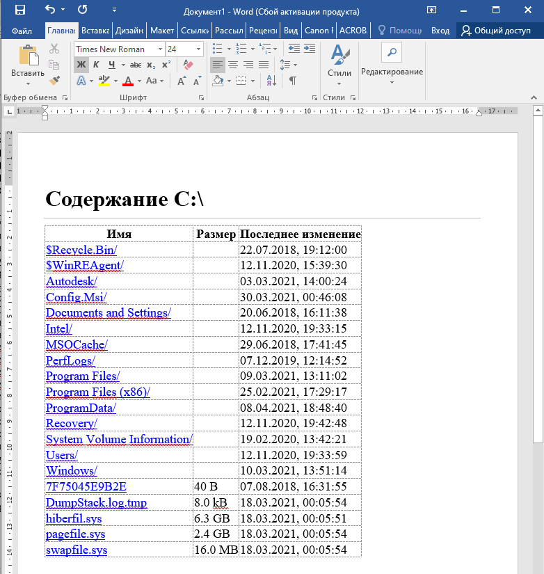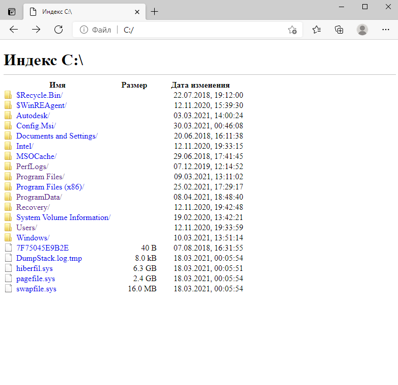 Иногда возникает необходимость отобразить содержимое диска или папки в виде таблицы. Чаще всего используют скриншот, но его невозможно редактировать и копипастить имена файлов/папок. Можно использовать скачанные утилиты, но я случайно обнаружил такое свойство у интернет-браузера (Проверено на Microsoft Edge, Chrome): в адресной строке вбить адрес диска/папки. Браузер отображает содержимое с возможностью навигации по папкам. Содержимое можно сохранить в html, mhtml, экспортировать в pdf, или в Excel, Word копипастом в виде таблицы.