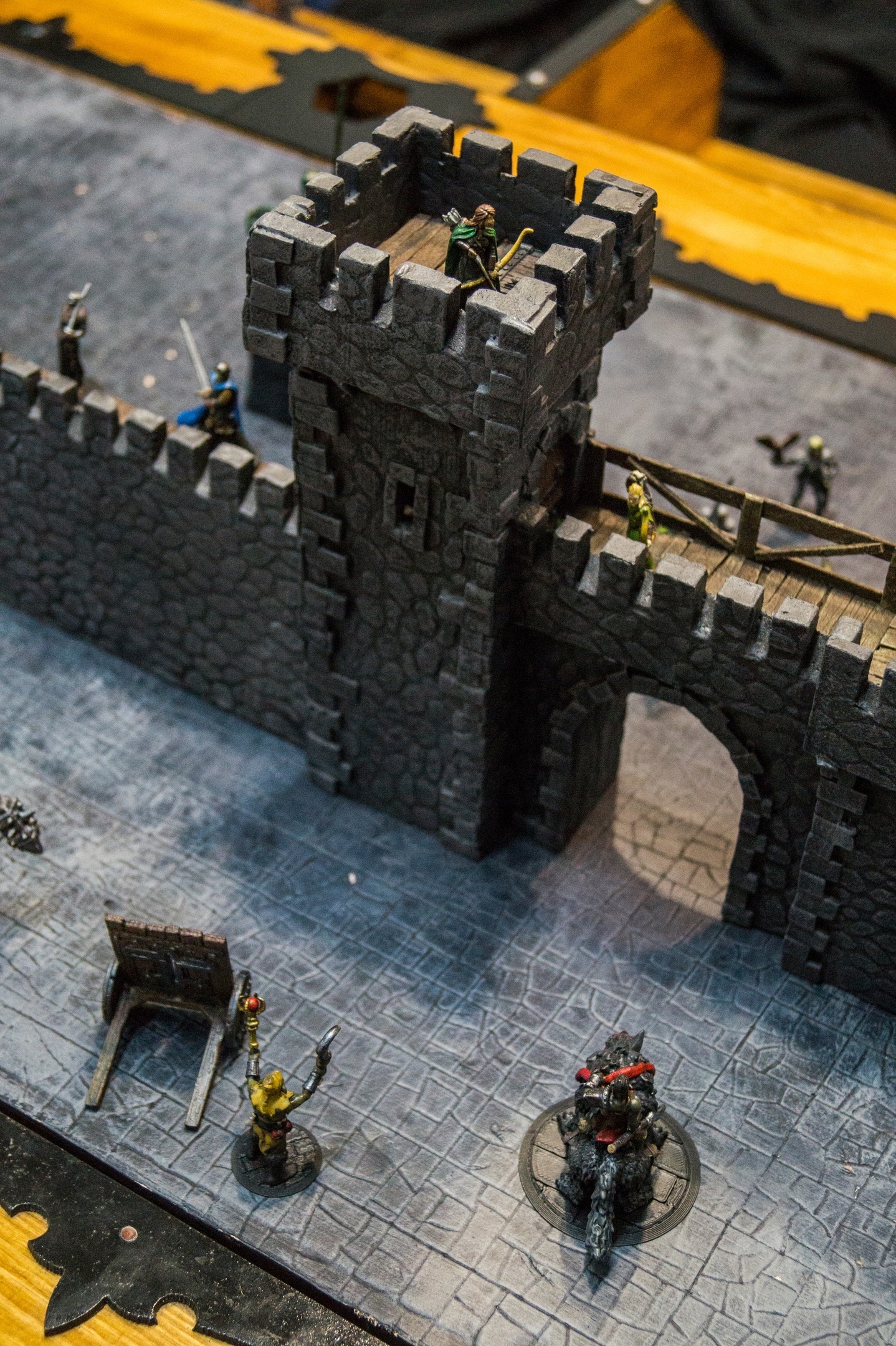 В нашем клубе настольных игр, где мы периодически тестируем свою продукцию один из ходовых форматов ДнД-сессий - это штурм города, где участники могут поиграть как за простых обывателей в осажденном замке, так и за разную сволочь пытающуюся перелезть через городские стены в целях грабежа и насилия. Так вот специально для таких сражений сконструировал ворота с башней и несколько секций крепостных стен. Техника как всегда несложная - нарезаем утеплитель нужной нам толщины (я обычно беру 8-10 мм), продавливаем штампом "каменная кладка", что серьезно ускоряет процесс, вырезаем зубцы, а из отходов делаем треугольники и вклеиваем их обратно в пазы стен, дабы нашим лучникам было удобно и сухо на посту. Крафтим из деревянных палочек галереи вдоль стен, грунтуем, красим и в бой!