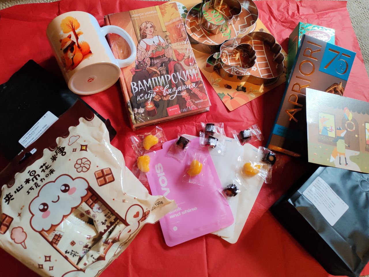 Кофе. Много кофе ☕ Это я одобряю )) Еще какао, шоколадка, конфетки, масочки, формы для печенек (печенищ!). А внутри очень красивой бумаги книга с крайне интригующим названием 😂