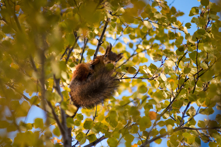 И рыжая красотка, из-за которой мы чуть не получили от сумасшедшей бабки палкой - собаки в лесу белку пугают, а я тварь бессердечная, не кормлю диких животных!