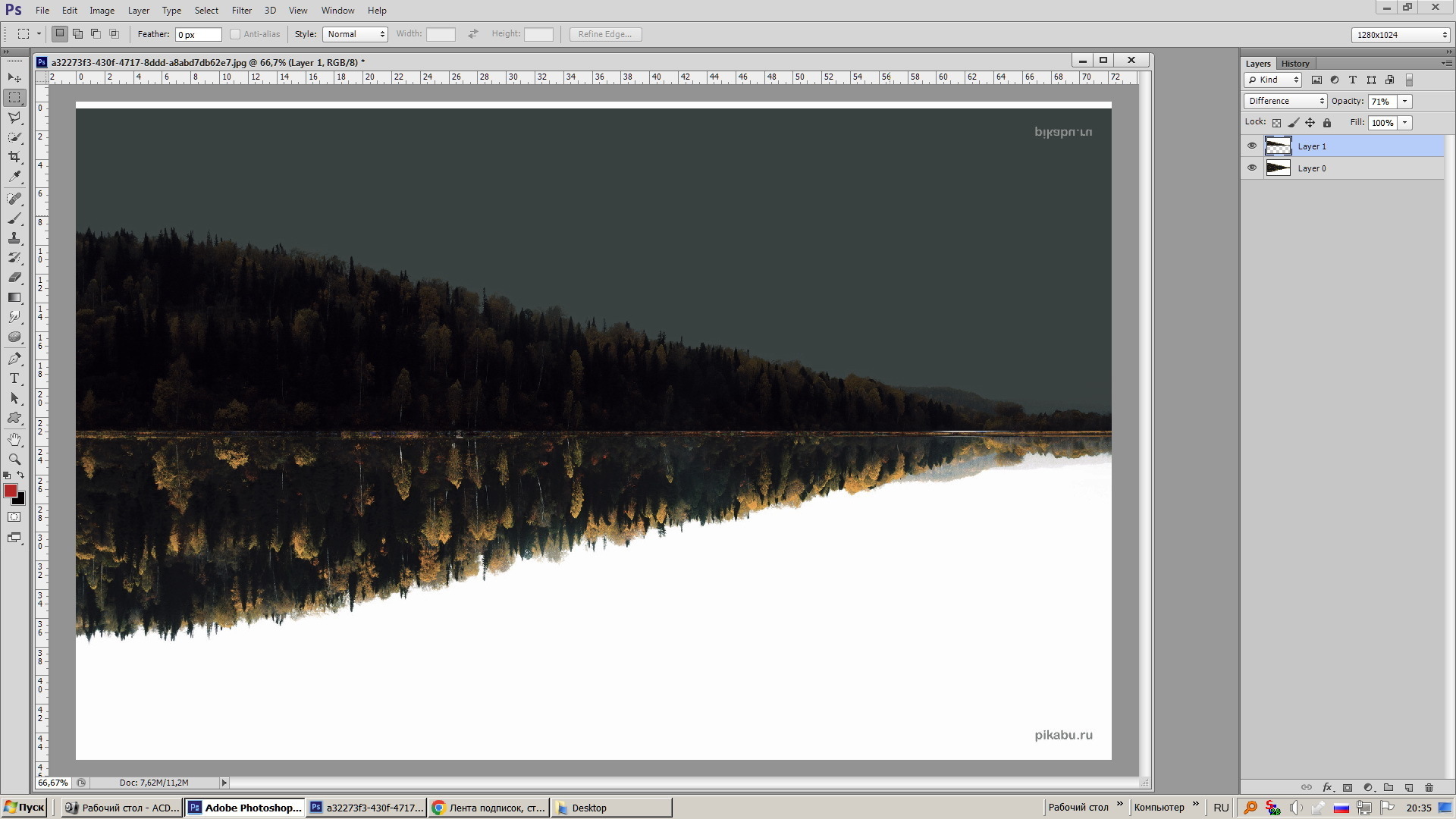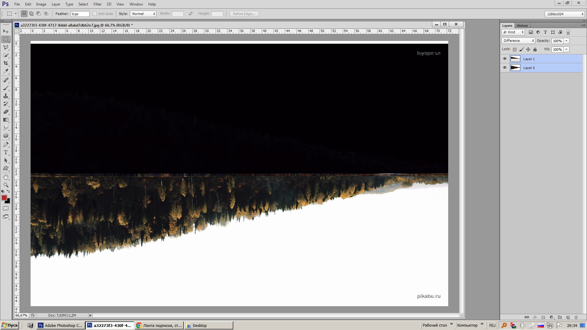 Взял я нижнюю часть, создал из неё слой, перевернул и наложил его на верхнюю часть в режиме наложения Difference. И - ни одного просвета, что говорит, что верхняя часть и типа отражение - одна картинка, иначе бы вычета до сплошной черноты не было бы (перевёрнутая надпись про Пикабу видна, потому что ей не с чем наверху вычитаться).