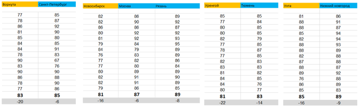 Я брал прогнозируемые данные за 14-27 января (я это делал 14 января) на гисметио по городам, которые были указаны. Желтым указаны «сухие» города, синим «влажные». Жирным выделено среднее значение влажности за 2 недели. Серым выделена средняя температура зимой