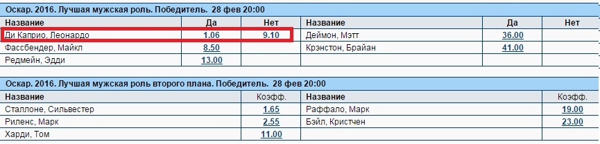 13 soldatkinandrey Оскар 2016 и букмекеры 10 лет назад Скрин из букмекерской конторы Марафон. Только для Ди Каприо есть ставка что он не получит Оскар)) Кстати, его шансы оцениваются как очень хорошие! И если все пойдет как всегда, можно неплохо заработать) Оскар 2016 Ставки на спорт Букмекеры Леонардо ди Каприо