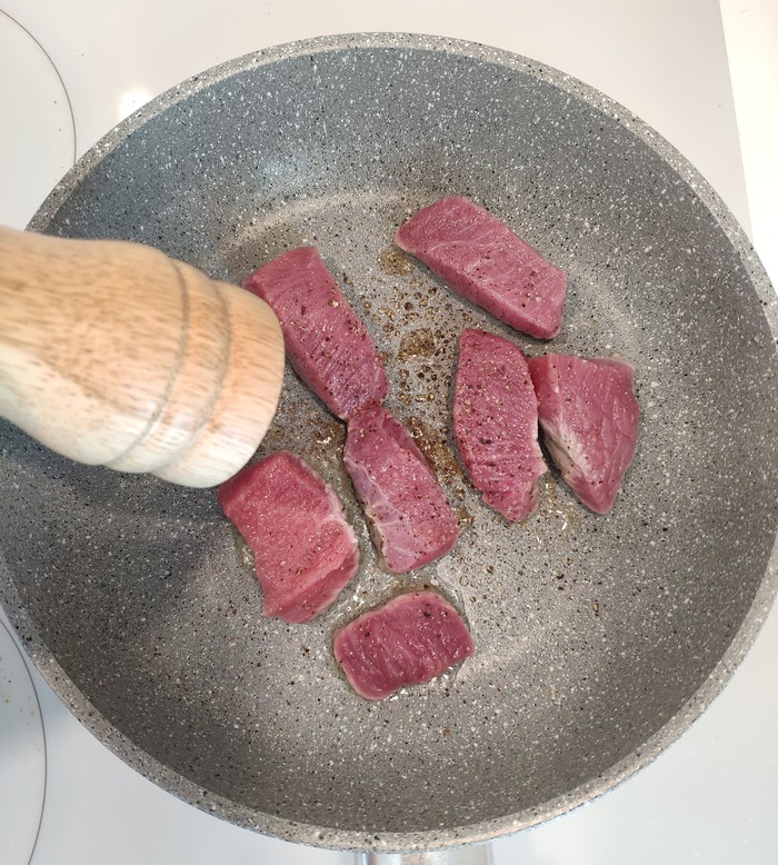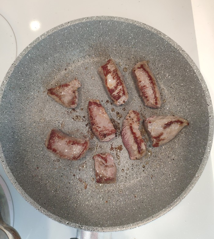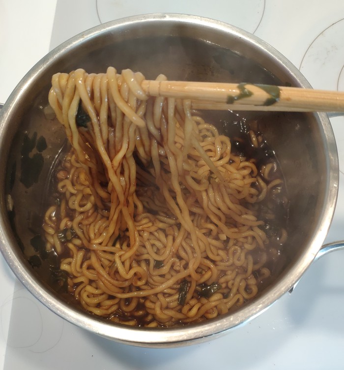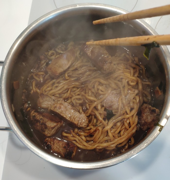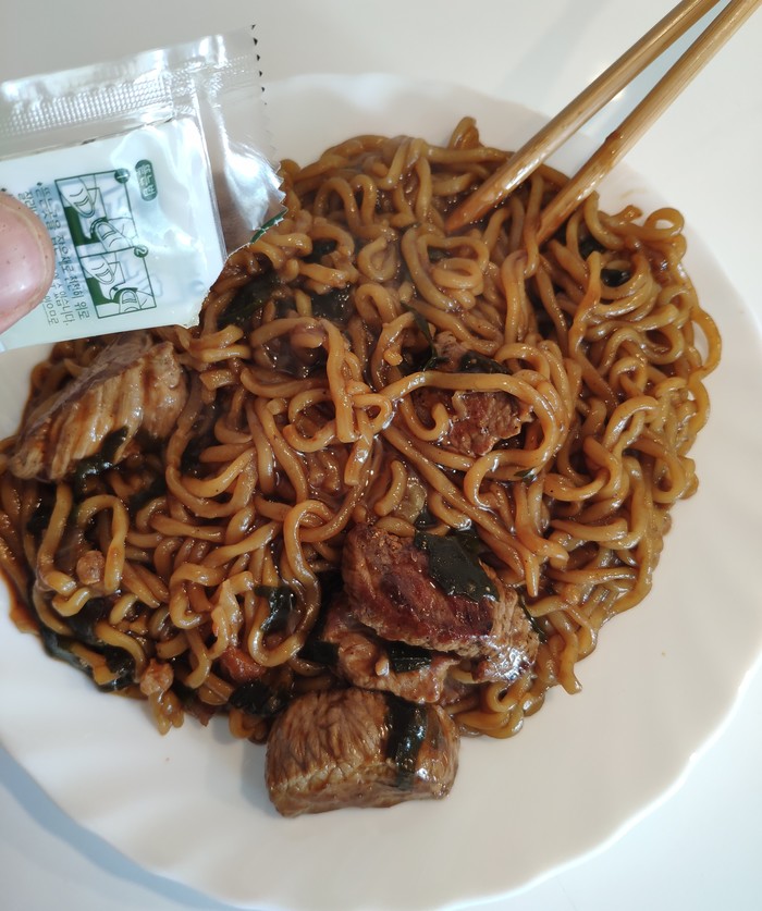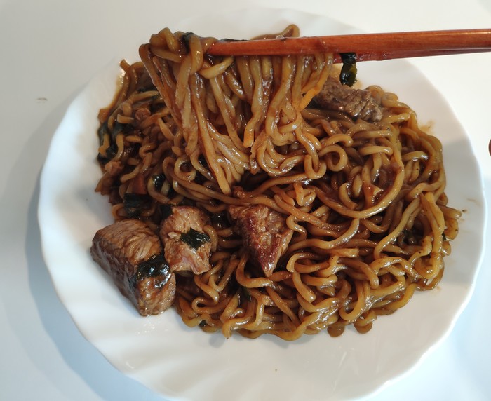 Вердикт. Вкус приправы из Chapaghetti (классический Чанчжан из черных бобов) забил все остальные вкусы. А приправа из Neoguri добавила остроты. Ничего особенного в общем. На любителя. Телятина кстати получилась не плохо, но это конечно не стейковое мясо, суховато.