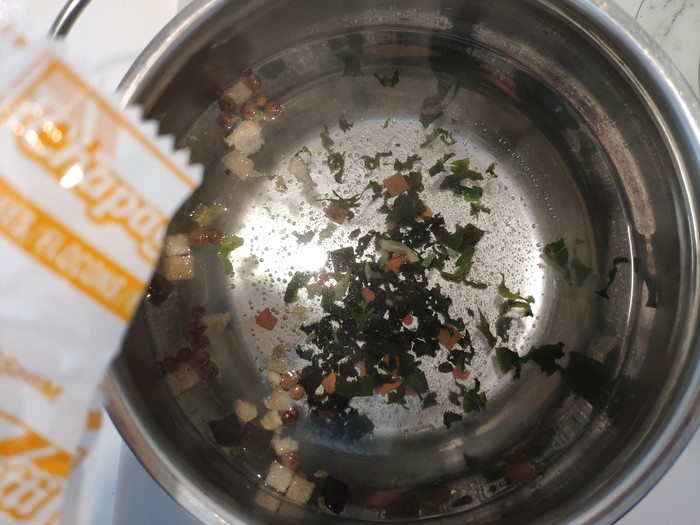 После 5 минут варки, сливаю большую часть воды, оставив примерно пол чашки и просто высыпаю приправу от Chapagetti.