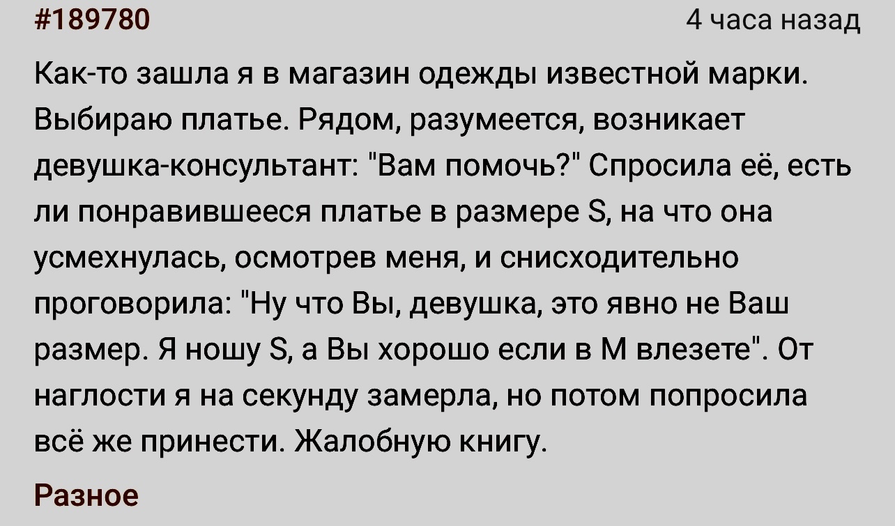 Я особо не люблю ни шубы, ни дублёнки и, видимо, оказалось, что я у своего мужчины первая такая одарённая, поэтому он по привычке страстно желал утащить меня в магазин поселковых понтов. Припёрлись, там консультант - тётка за... 50(?), да хуй знает, не молодая короче. Говорю, мол ладно давайте вот эту дублёнку, вроде плюс-минус приличная, мне 40 размер. И тут эта мадам выдаёт: "Нееет, я вам сначала дам 44, вы своих размеров не знаете, а я на глаз вижу". Я конечно охуела, но подумала, что у них там свои заморочки с размерной сеткой. Напялила я эту меховую плащ-палатку, стою как ебучий Филлипок, утопаю в мехах тксзть (во мне ещё роста чуть выше табуретки). Тётка радостно квохчет вокруг меня "Ой, ну вот как хорошо, сейчас подпояшу ..." - начинает тянуть пояс и вдруг вскрикивает "БОЖЕ, У ВАС ТАЛИЯ!!!". "Ну, охуеть, - сказала я, - пожалуй, на сегодня с меня хватит уебанского сервиса", кинула ей дублёнку в руки и учесала.