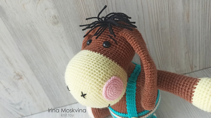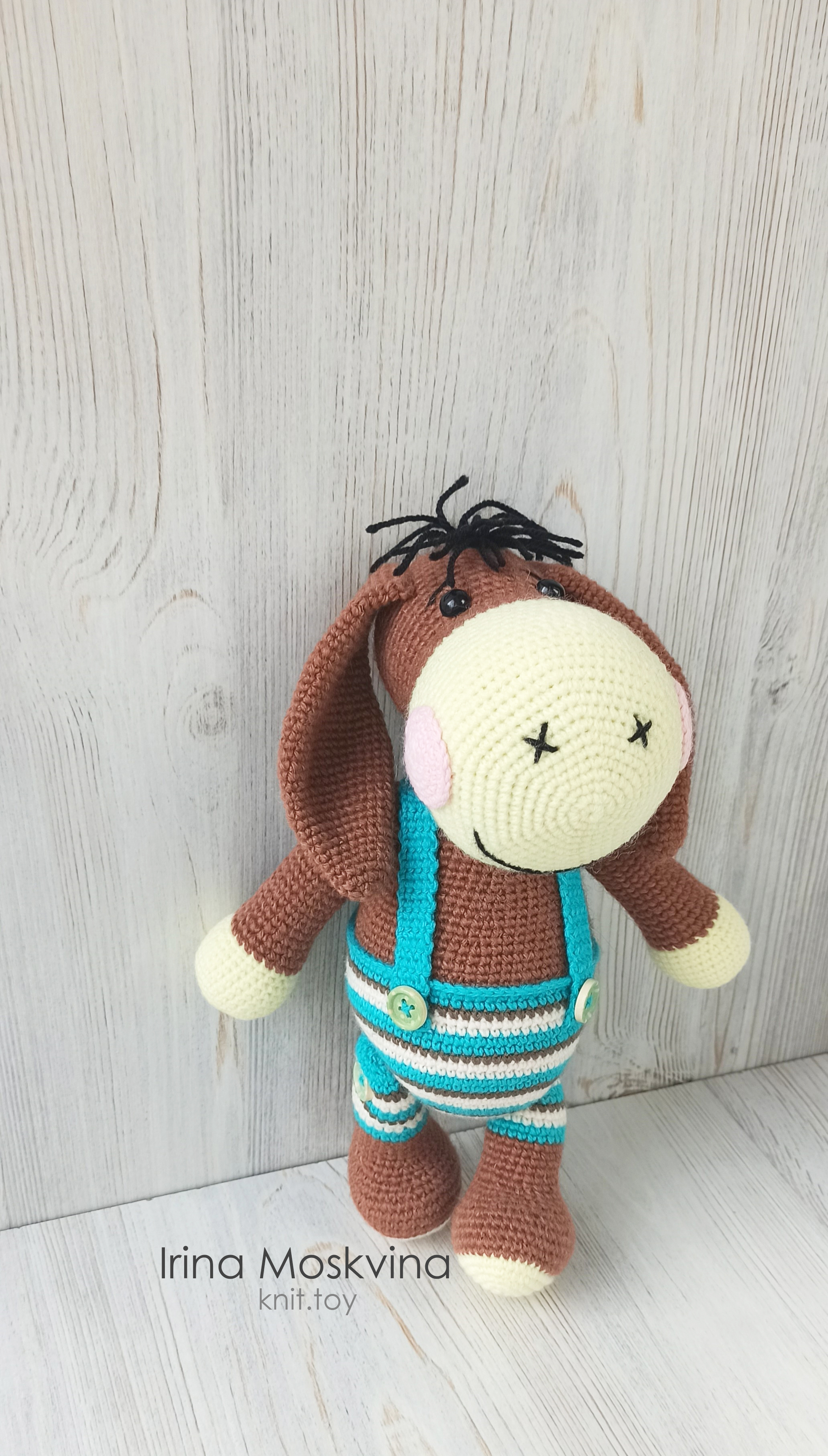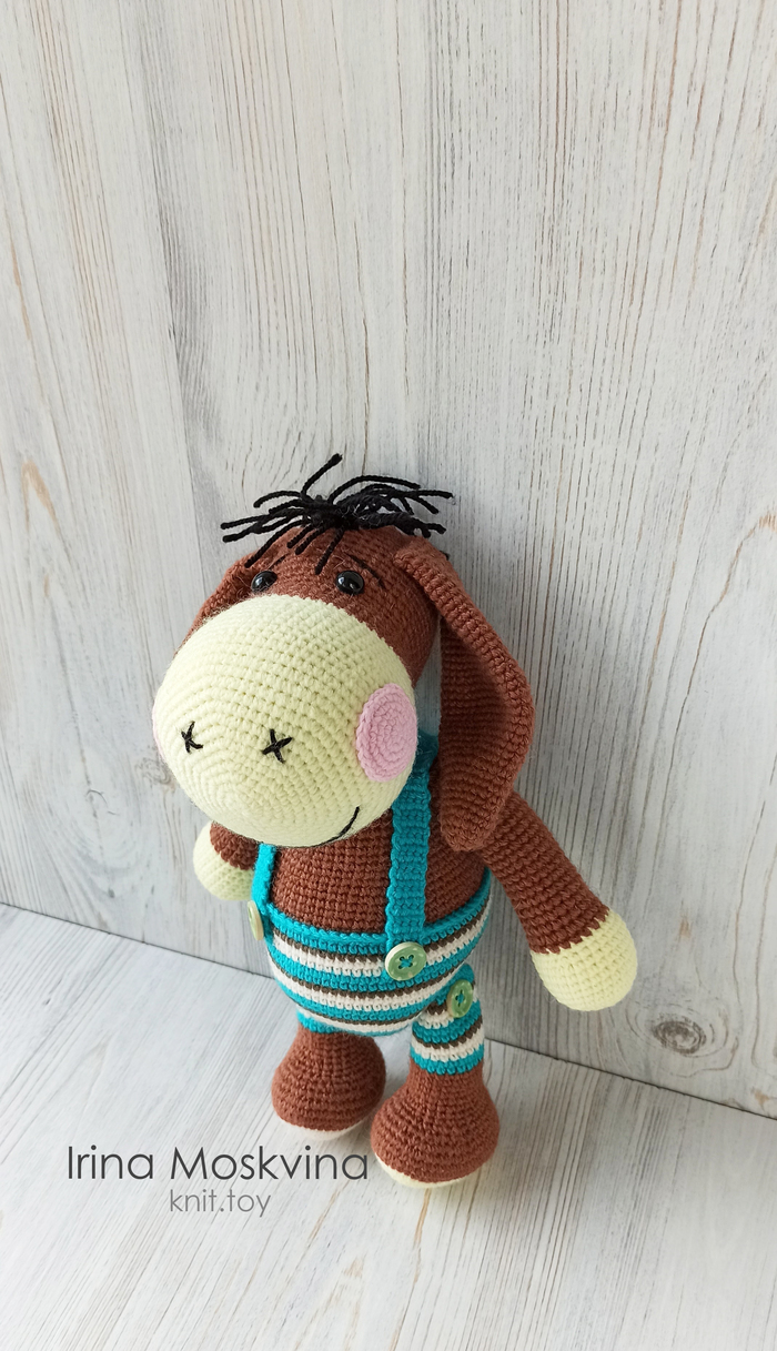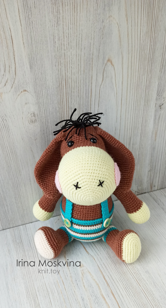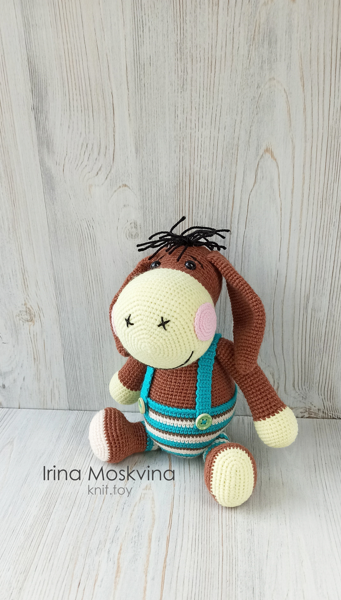 Ножки на нитяном креплении, благодаря чему ослик может самостоятельно сидеть и стоять с опорой.