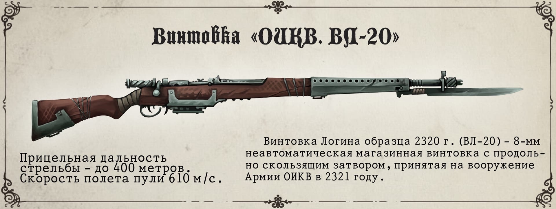 Винтовка Логина 2320 года (ВЛ-20) – магазинная неавтоматическая винтовка, принятая на вооружение вооруженных сил Объединенной Империи в 2321 году.