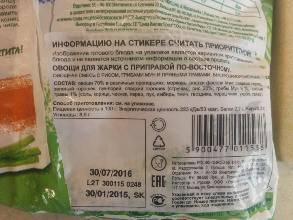Подумал, что лёд так странно замёрз. Но чёж он не тает на сковороде то, а?! Смотрю ещё раз на пачку из-под овощей и вижу наклейку. Наклейка то не просто так. Её на конвеере лепят на пакеты с овощами в качестве уведомления об изменении состава. Ну всмысле прямо вот уведомления там нет, просто состав новый напечатали, и приписали вот это вот: "информацию на стикере считать приоритетной". И на стикере напечатали новый состав, где 20% уже составляет рис. РИС! СРАНЫЙ РИС, понимаете? Не, ну с натяжкой это тоже овощем можно считать, но епта... Ну что в голове у людей. которые такую клёвую смесь разбадяжили голимейшим рисом? :(