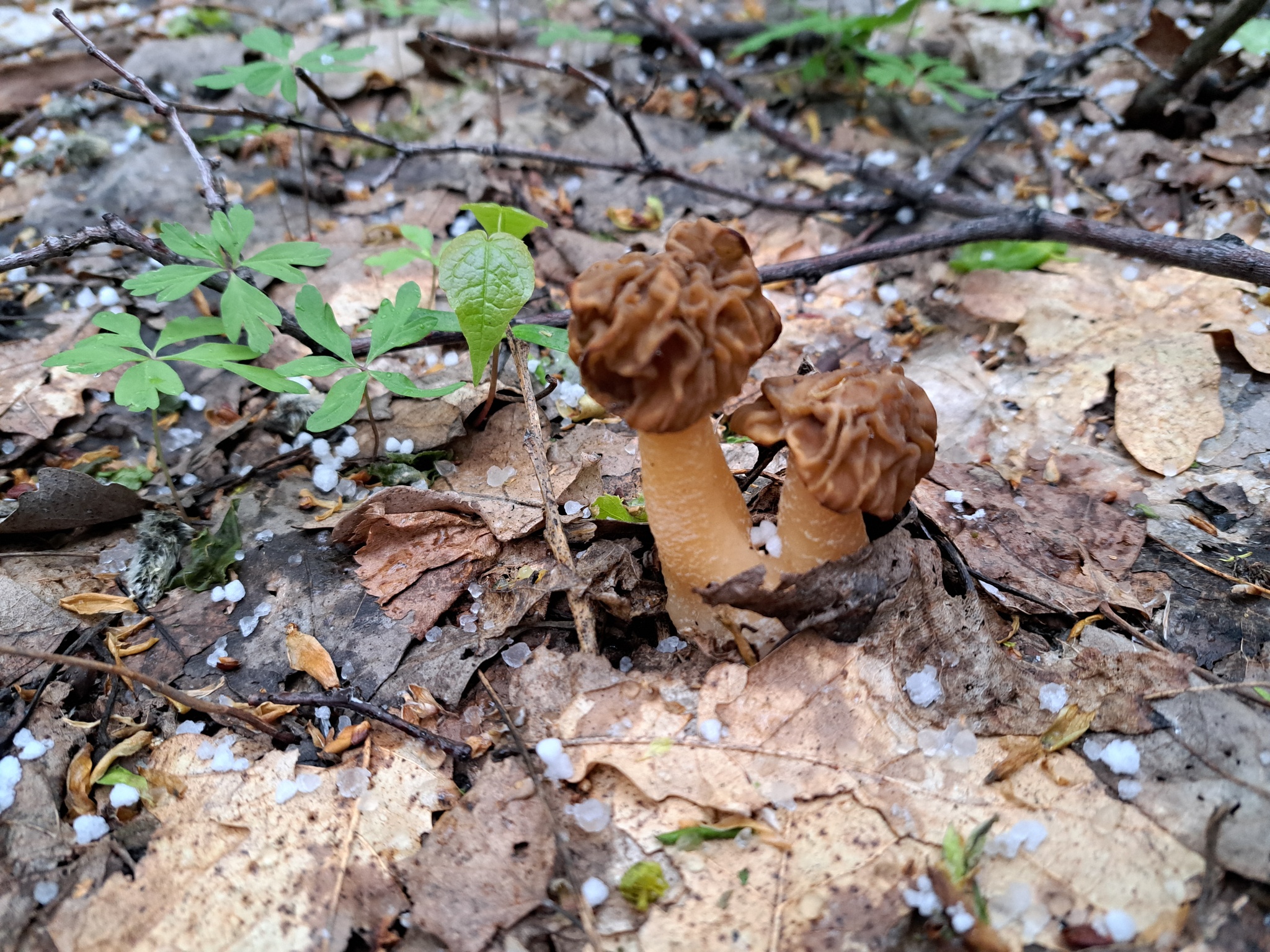 Необычно выглядят сморчковые шляпки на фоне снежной крупы.
