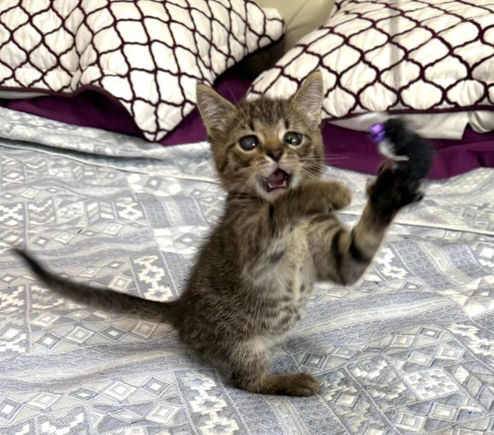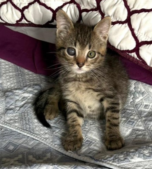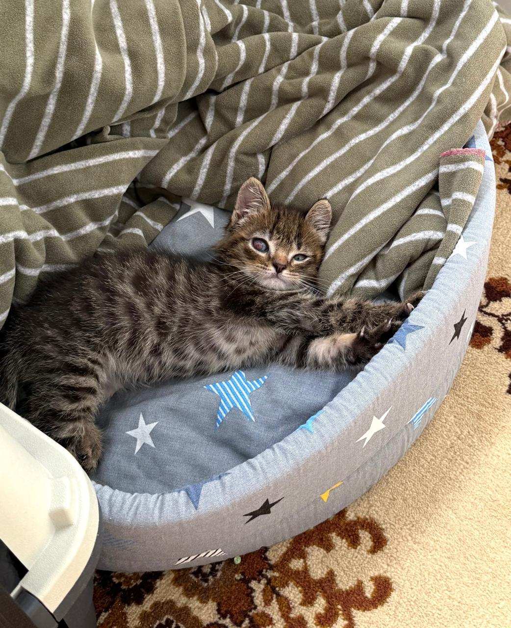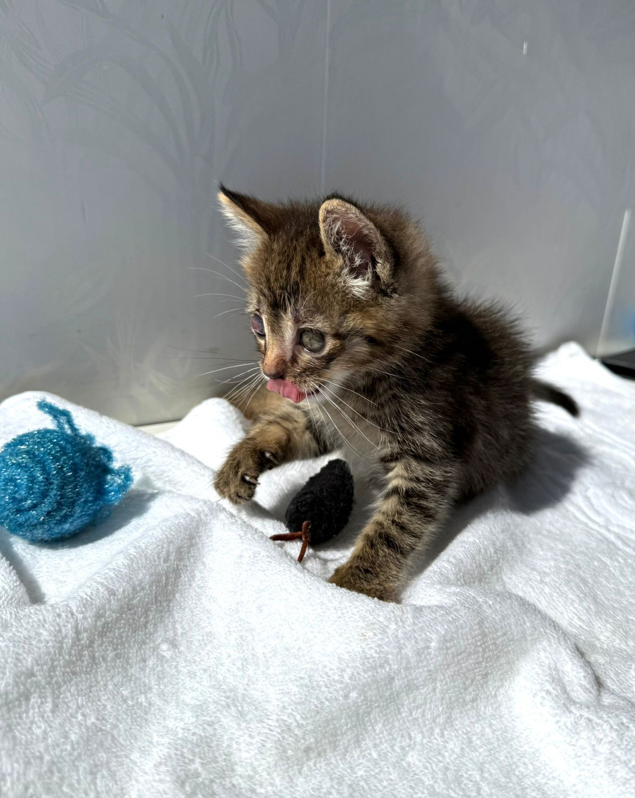 Этот малыш был найден совсем крошечным и в плачевном состоянии, ему было всего 3 недели, выкармливали из соски. Выходили, пролечили, готовим к вакцинации. К сожалению, один глазик не будет видеть, второй видит на 100%. Но и это ему не мешает жить и активно играть с сородичами.