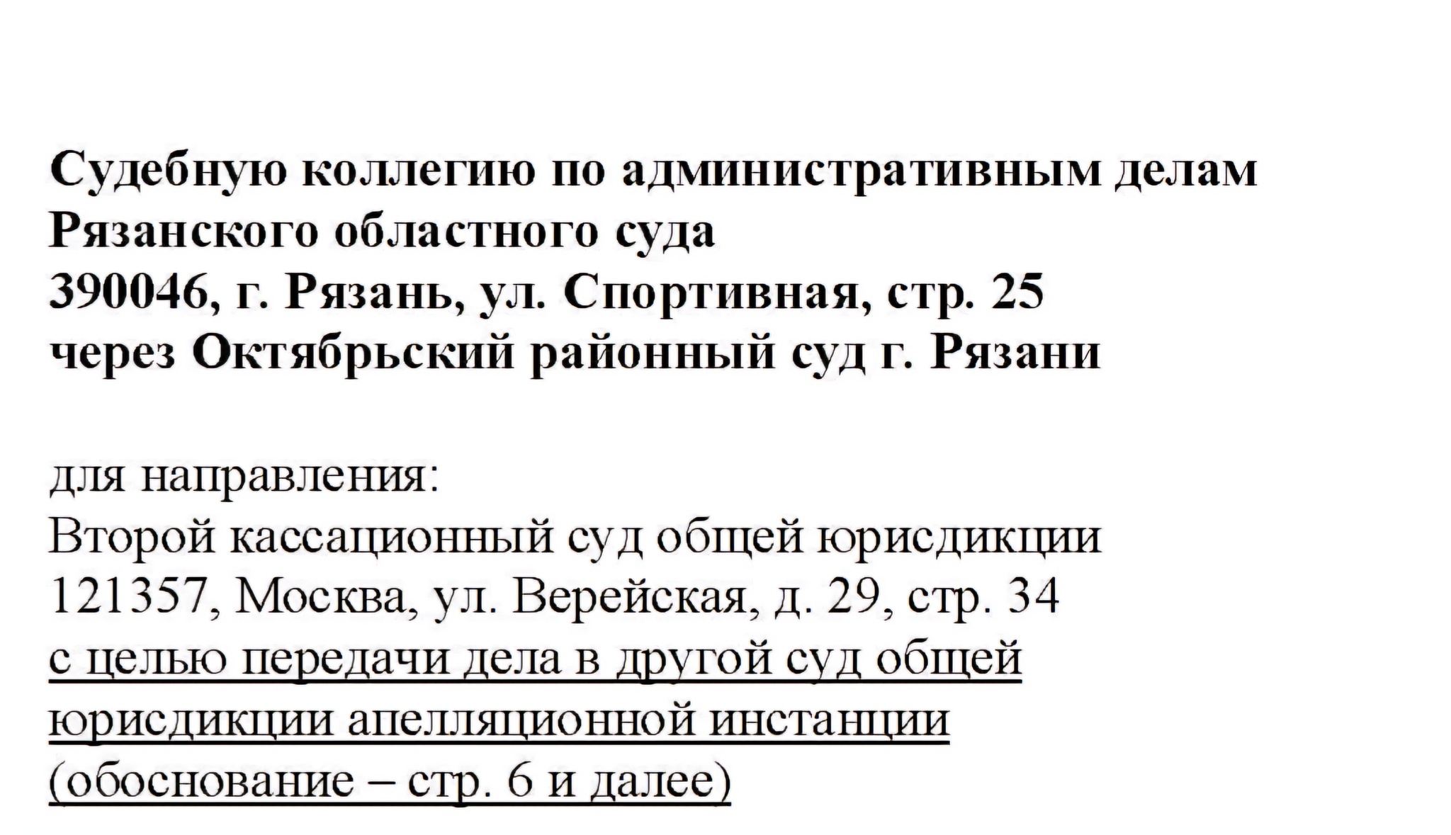 А раз ККС имеет возможность вмешиваться и в деятельность областного суда, то и апелляционная жалоба при таких обстоятельствах подлежит рассмотрению иным судом апелляционной инстанции, который надлежит определить в суде кассационной инстанции - 2 кассационном суде общей юрисдикции. В случае отмены решения Октябрьского районного суда г. Рязани - дело будет направлено на новое рассмотрение судом первой инстанции, находящемся в ином регионе.