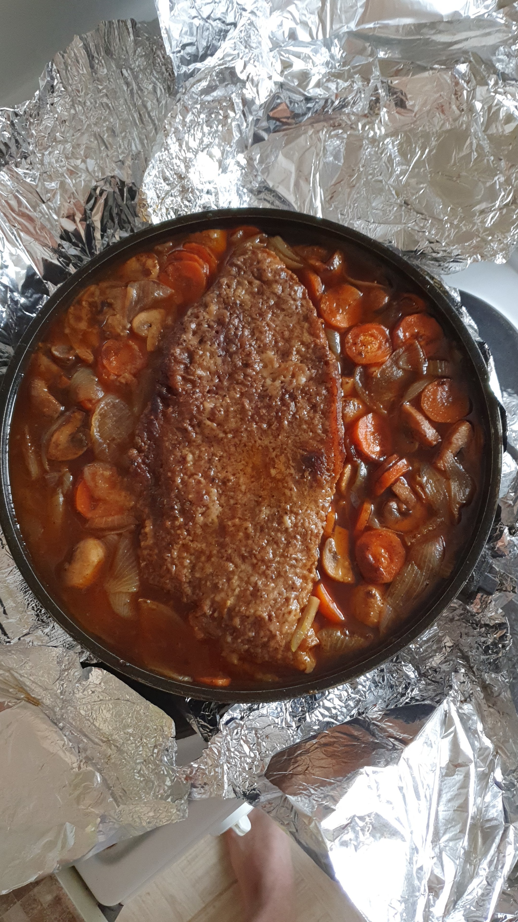 Далее берём глубокую форму для выпекания, выкладываем стейк на дно и заливаем содержимым сковороды. Если стейк покрыт не полностью, добавьте кипятка. Теперь очень важный момент. Нужно очень плотно закрыть ёмкость фольгой. На всякий случай - в 2 слоя. Отправляем в духовку на 2 с половиной часа при температуре 180 градусов.