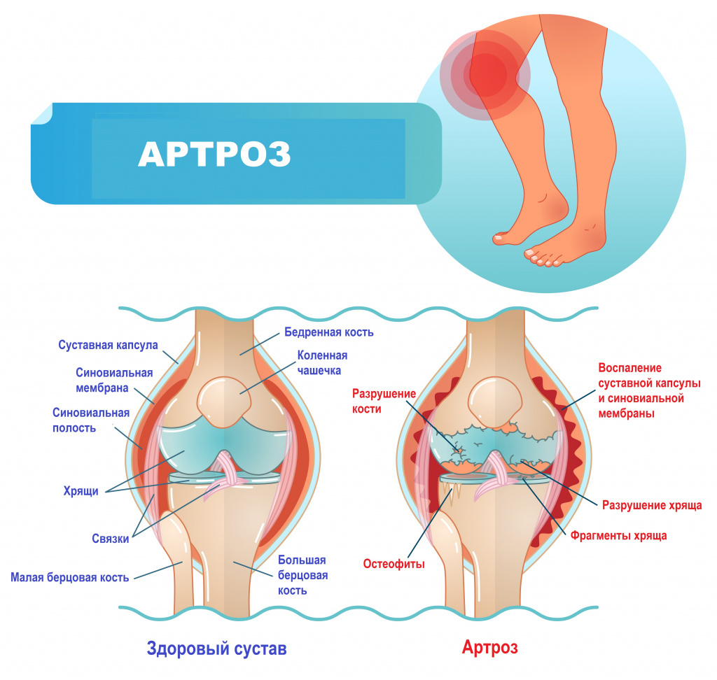 🦵Остеоартроз – заболевание суставов, характеризующееся разрушением хрящевой ткани и др структур, образующих сочленение – подхрящевых частей кости, капсулы, синовиальной оболочки, связок, мышц