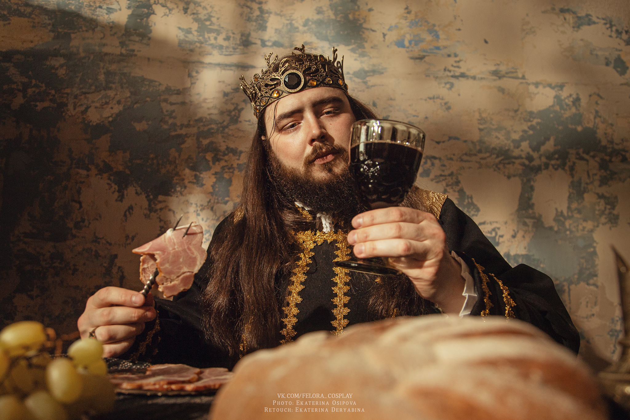 Почитав первоисточник, обнаружила, что Роберт Баратеон не такой уж и старый помятый алкаш, как показали в сериале. Поэтому мы с товарищем воздали персонажу должное. С меня костюм и ретушь, с него - лицо и шикарное накладное пузо.