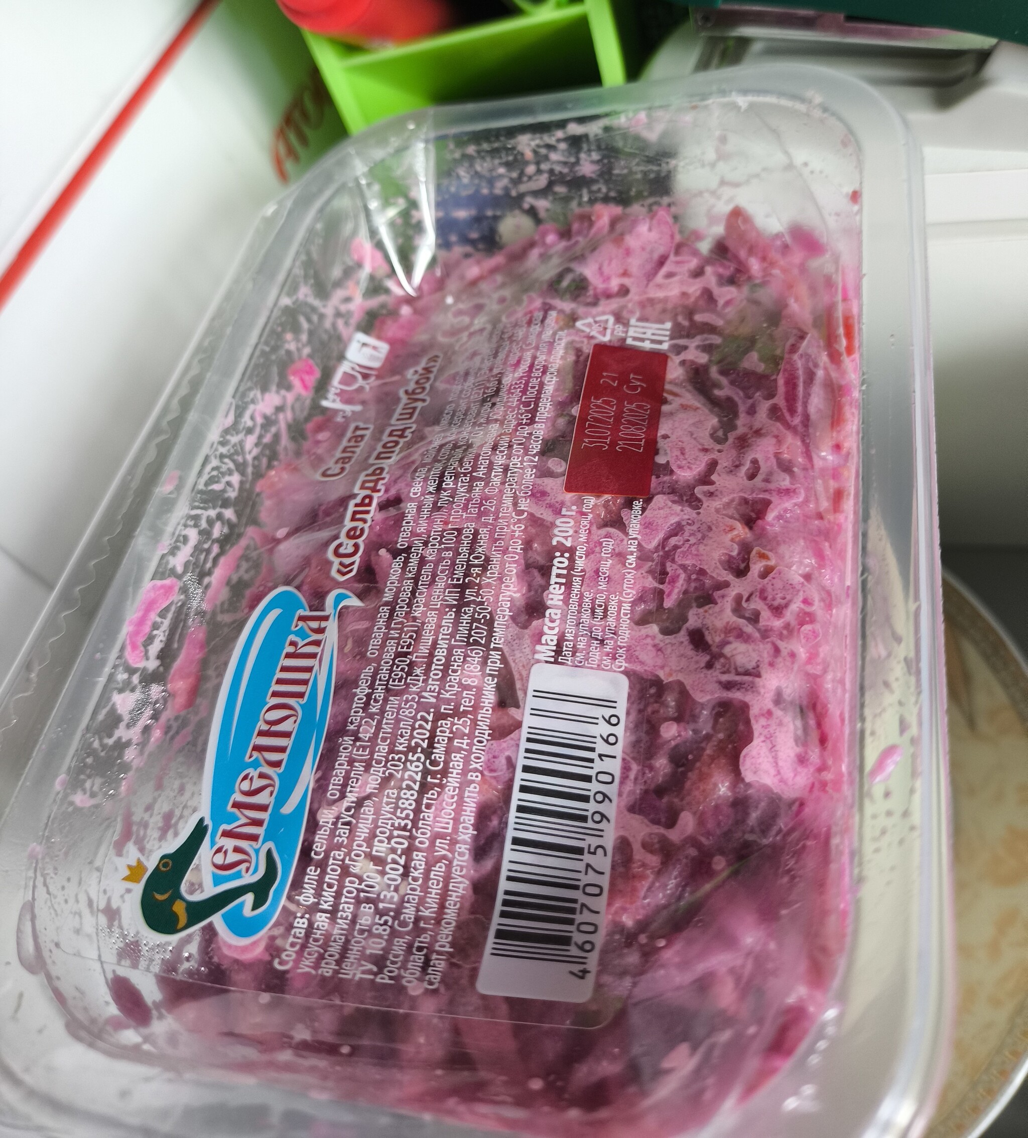 Мошенники в Магните. Купил селёдку под шубой, по срокам вроде бы все норм и не вздутая . А уже когда собрался поесть, через 20 мин после покупки, заметил что одного уголка плена неплотно приклеена, точнее просто ровно лежит. Ну, и как вы догадались, салат оказался испорченный. Т.е. в магазине, скорее всего, обнаружили вздутие и аккуратно спустили образовавшиеся газы. Вот так дурят нас. Возврат сделать нет времени , да и чек не захватил.