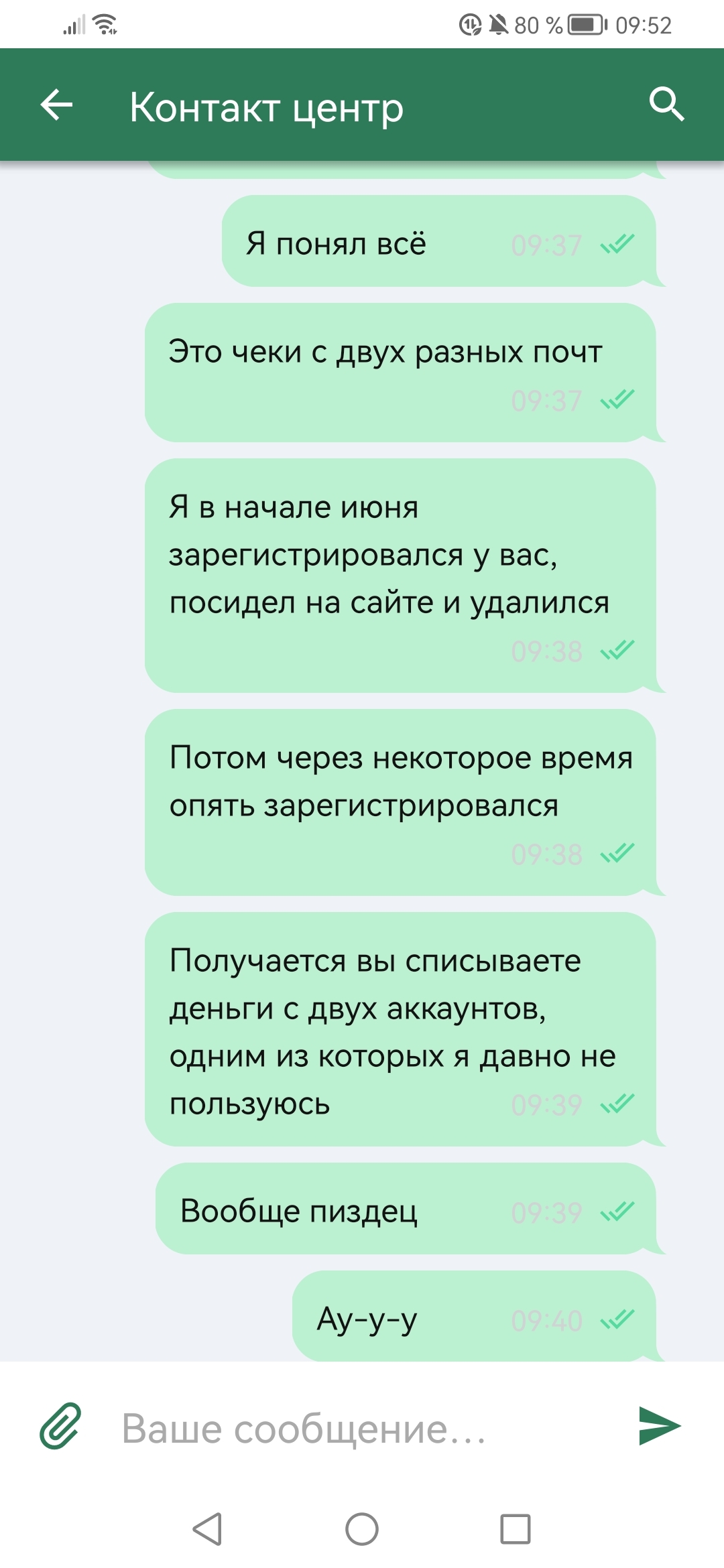 Как вы видите из переписки деньги у меня списывали из двух аккаунтов поочерёдно, но с одной карты, и чеки присылали на две разные почты: