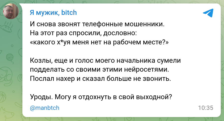62 imctobitch Норм автор Юмор для всех и каждого Юмор Осторожно, машенники звонят! Не ведитесь! 1 год назад 🧔♂️ Телеграм-канал [моё] Мошенничество Телефонные мошенники Искусственный интеллект Deepfake Юмор Мужчины Мат Звонок 4 Ещё 0