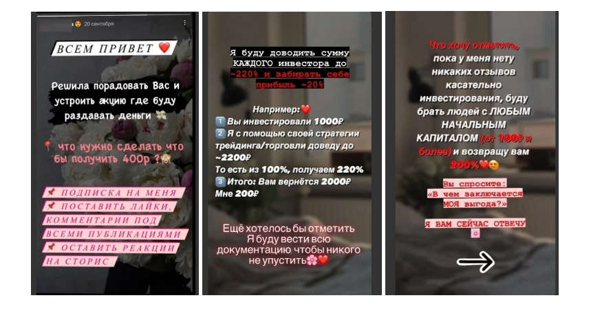 По словам правоохранителей, в первую очередь для потенциальных жертв создают иллюзию эксклюзивности («Только для избранных»). Также мошенники обещают высокую доходность без риска («Доход 10% в месяц! Без потерь!»). Очень популярным рычагом давления у любых мошенников, в том числе инвестиционных, является срочность («Только сегодня!», «Только пять мест! Последний шанс!»). Для убедительности аферисты используют поддельные графики и отчеты, подключают лжеэкспертов и создают липовые отзывы.