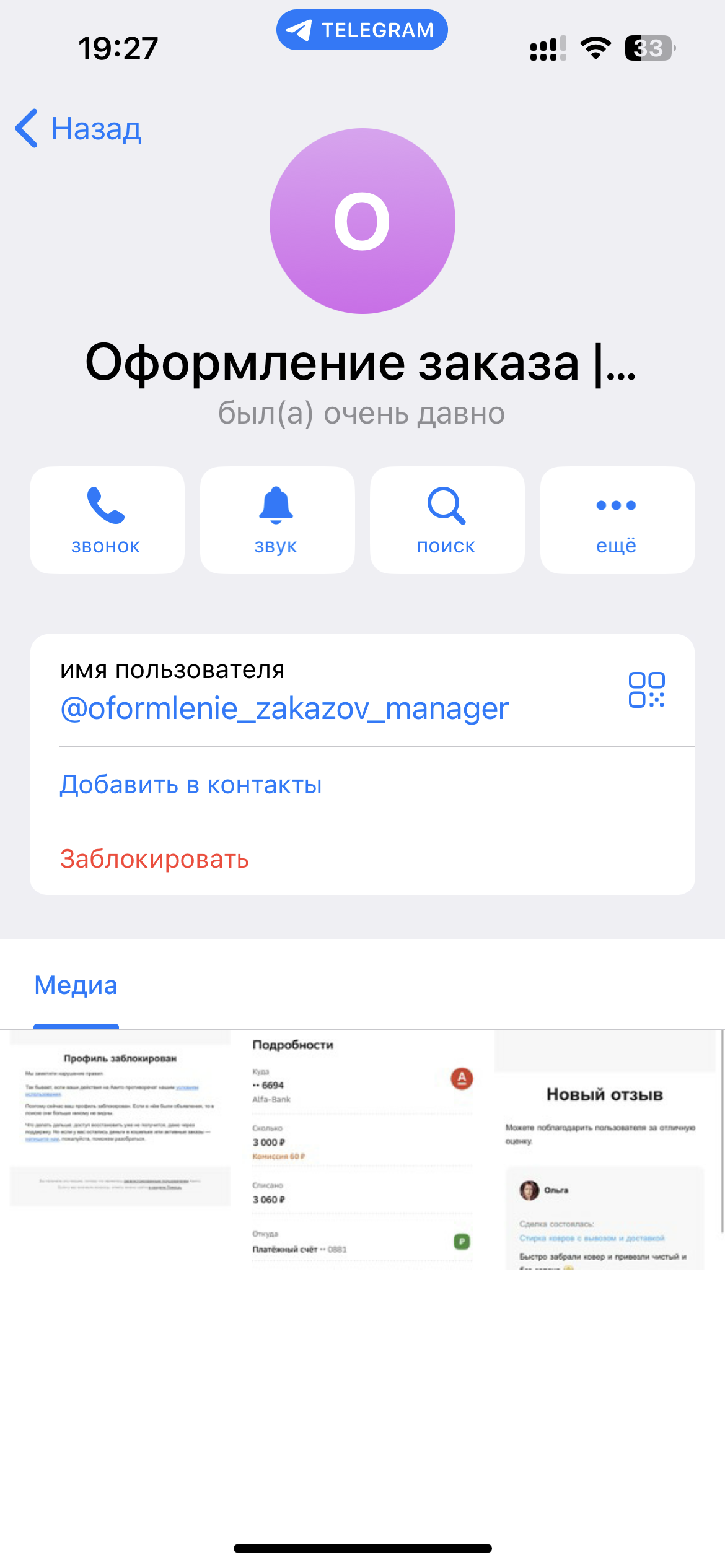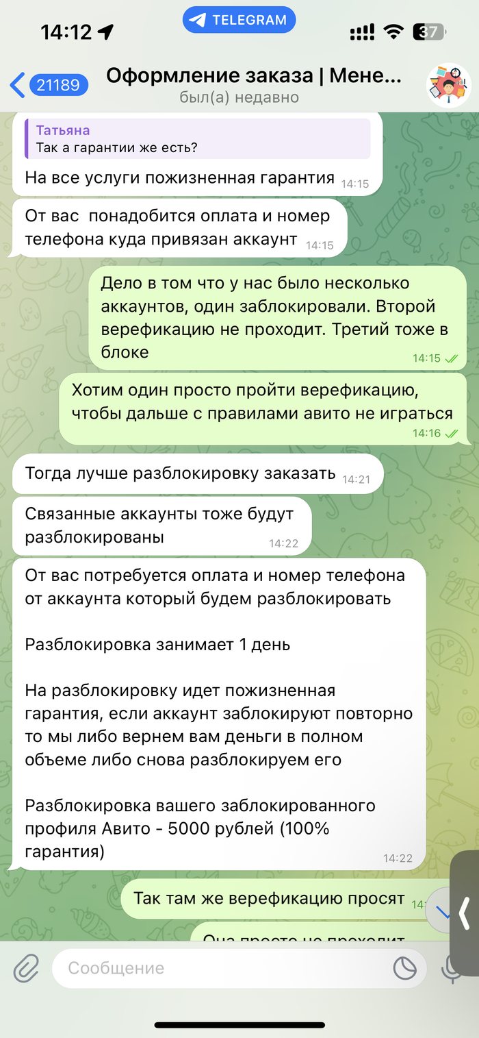 📛 Канал занимается обманом пользователей, предлагая услуги в сфере авито ( верификация, покупка отзывов, разблокировка и т.д), а после получения денег первый день выходит на связь, а на следующий день блокирует. Никаких обязательств они не выполняют.