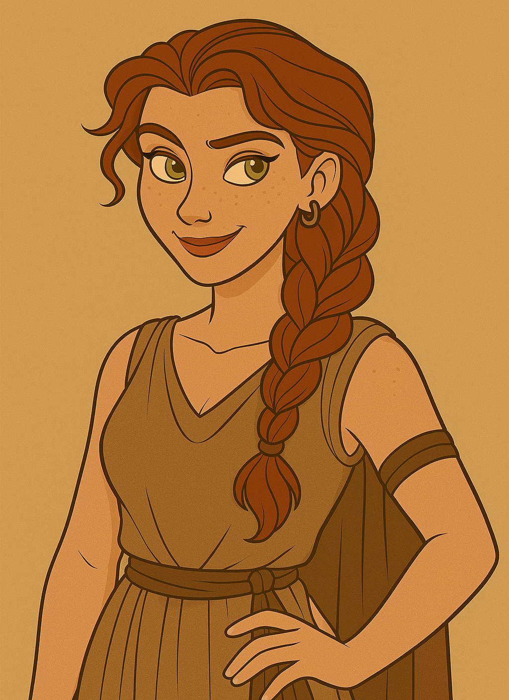 Она чуть склонила голову, откинула назад несколько рыжих прядей, выбившихся из небрежной косы. На щеке — веснушки, на губах — чуть виноватая улыбка, в глазах — хищный свет. Жёлто-зелёный, острый.
